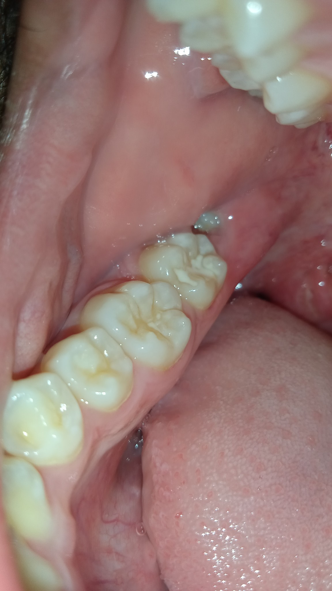 เมื่อวานถอนฟันกรามซี่ในสุดมา เช้าวันนี้ส่องกระจกมีอะไรตรงเหงือก เป็นเบ้ากระดูกหรือเศษฟันที่ถอนไม่หมดครับ แบบนี้เป็นอะไรมั้ยครับ