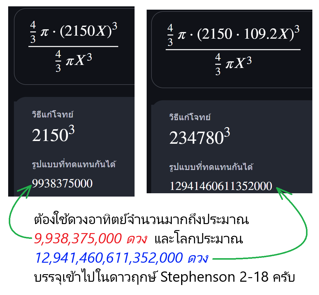 ก็คือเอาสูตรคณิตศาสตร์ของปริมาตรทรงกลมมาหารกันเลย และเปลี่ยนเพียงค่ารัศมีของทรงกลมเท่านั้น ตัวเลข 2,150 และ (109.2 • 2,150) ก็คือขนาดรัศมีดาว Stephenson 2 เทียบกับดวงอาทิตย์และโลกครับ แต่การคำนวณแบบนี้จะเป็นการคำนวณหารกันตรง ๆ ด้วยปริมาตร ซึ่งมีข้อสังเกตก็คือหากจะเอาลูกกลมเล็ก ๆ อย่างเช่นลูกกลมของโลกไปใส่ในดาวดวงที่ใหญ่กว่า มันก็จะมีช่องว่างของปริมาตรอยู่ด้วย ดังนั้นจำนวนของลูกกลมที่บรรจุได้ก็จะน้อยลงครับ การคำนวณลักษณะนี้จะยากมากผมเองก็ทำไมเป็นเหมือนกันว่าจะคำนวนโดยคิดช่องว่างปริมาตรได้ยังไง