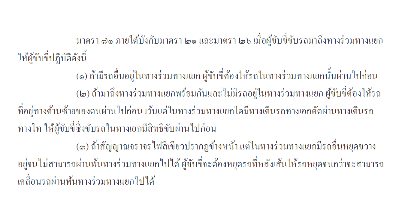 1. ถ้ามีรถอื่นอยู่ในทางร่วมทางแยก ผู้ขับขี่ต้องให้รถในทางร่วมทางแยกนั้นขับผ่านไปก่อน