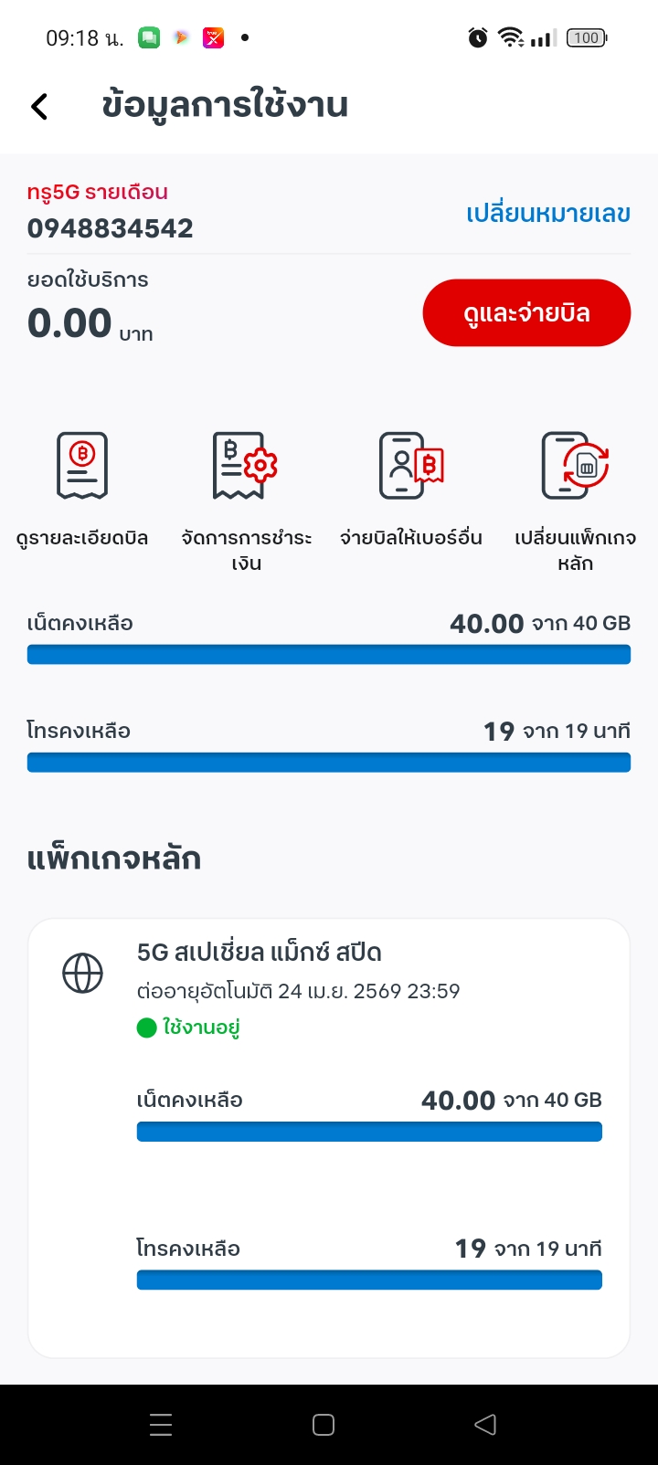 เปลี่ยนโปรเน็ต 40 GB โทร 100 นาทีแต่ทำไมเช็คใน true service แล้วได้โทรแค่ 19 นาที