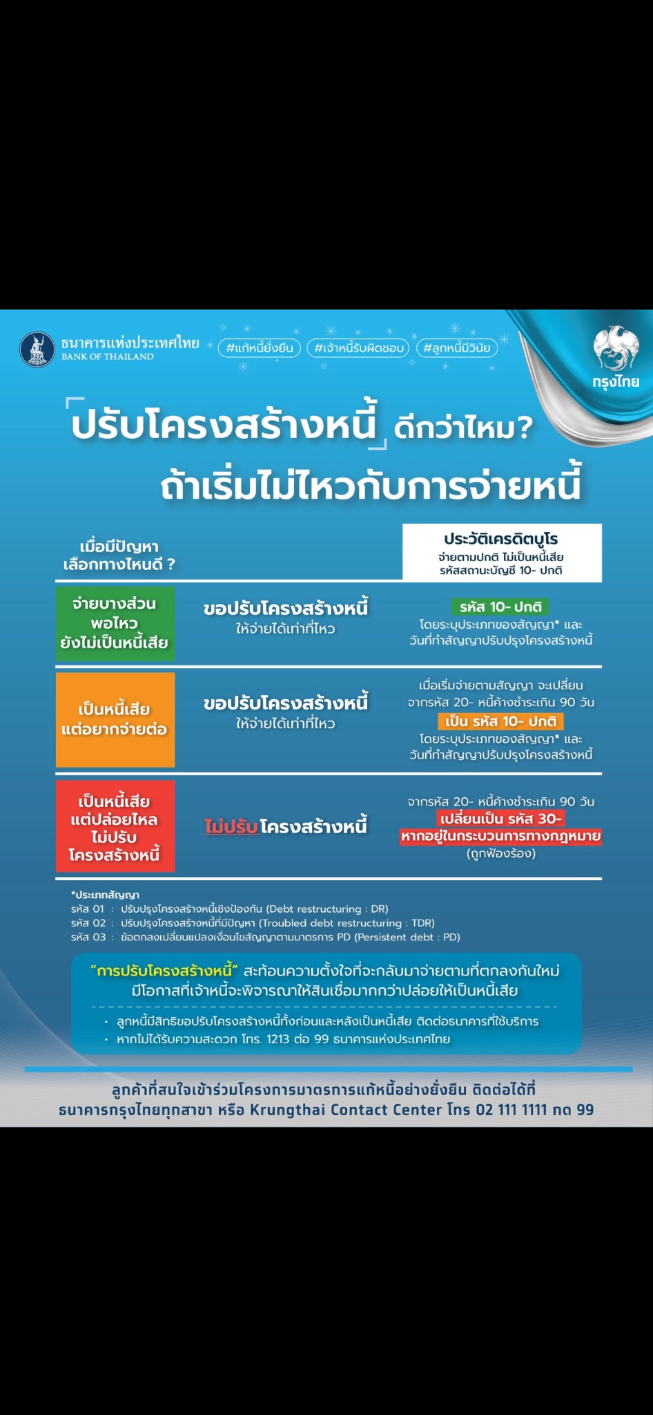 อนหนี้เสีย และอยากรู้ว่าปรับดีไหม เพราะมีแพลน จะกู้เงินของกรุงไทย ที่เป็นข้าราชการ ถ้าปรับไป จะส่งผลให้กู้ได้ไหม แต่ เห็นภาพโปสเตอร์ปรับหนี้ ว่าไม่ติดบูโร แต่ธนาคารกรุงไทยจะให้กู้ไหม อยากทราบ