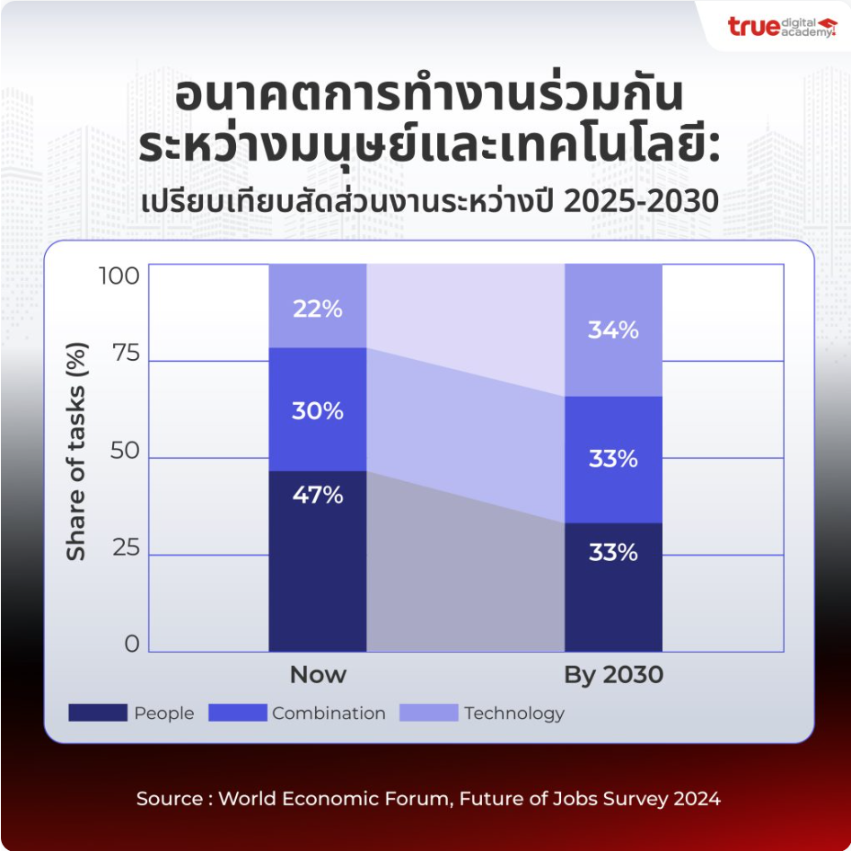 นอกจากนี้ในรายงานของ Work Change Report: AI Is Coming to Work ของ LinkedIn ยังเน้นอีกว่า กว่า 10% ของตำแหน่งงานในปัจจุบันเป็นงานที่ไม่มีอยู่เมื่อปี 2000 เช่น วิศวกร AI (AI Engineer) และหัวหน้าฝ่าย AI (Head of AI) สิ่งนี้แสดงให้เห็นว่า AI กำลังเร่งให้เกิดการเปลี่ยนแปลงในตลาดแรงงานอย่างรวดเร็ว และคาดว่า ภายในปี 2030 ทักษะที่ใช้ในงานส่วนใหญ่จะเปลี่ยนไปมากถึง 70% ซึ่งหมายความว่า แม้ว่าคุณจะไม่ได้เปลี่ยนงาน แต่งานของคุณก็กำลังเปลี่ยนแปลงไปเอง!