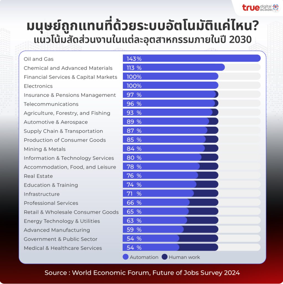 – กว่า 95% ของงานที่ลดลง จะมาจาก Automation ที่ทำอะไร ๆ ได้เองมากยิ่งขึ้น