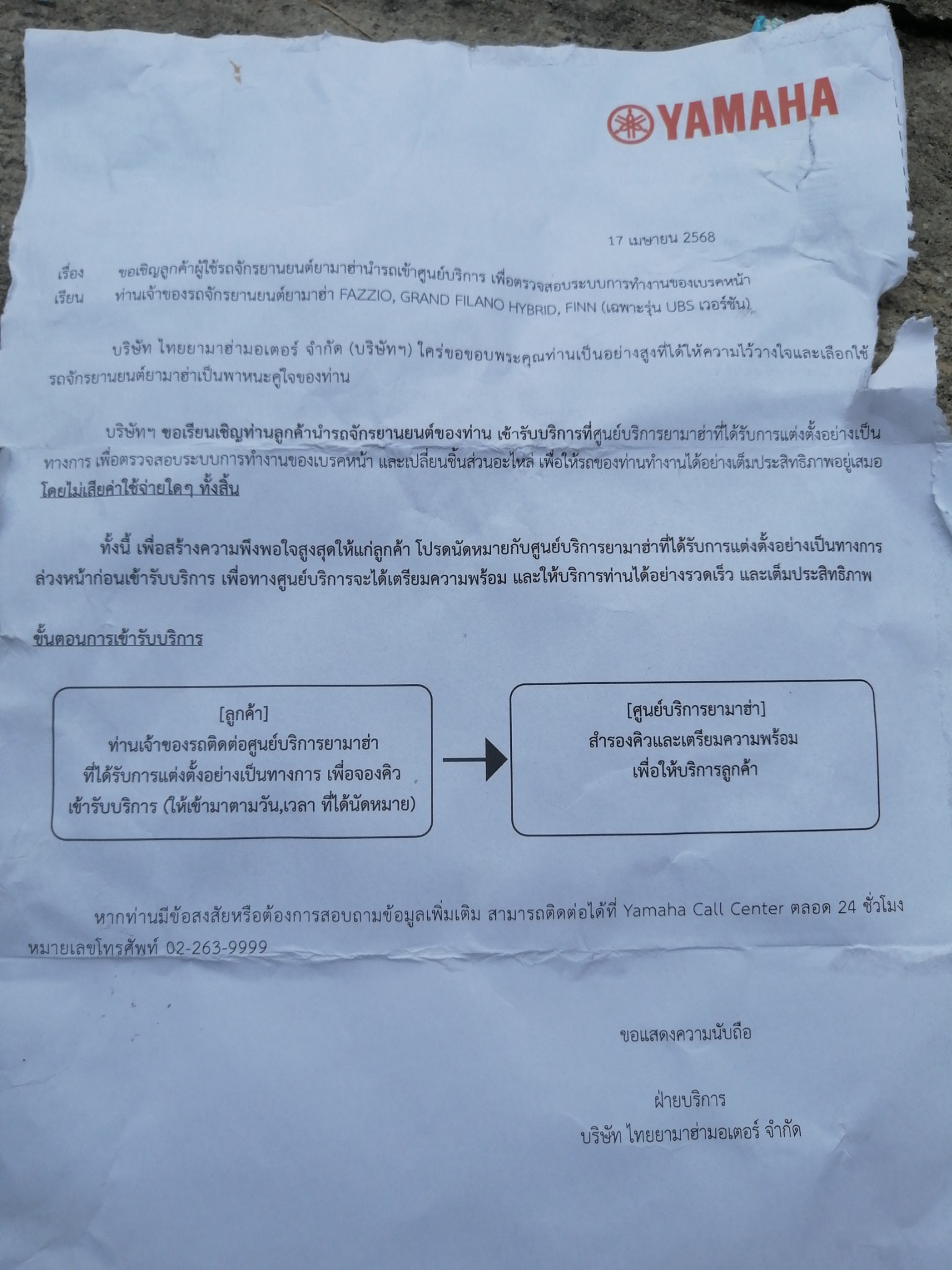 จดหมายจากบริษัทไทยยามาฮ่ามอเตอร์จำกัด