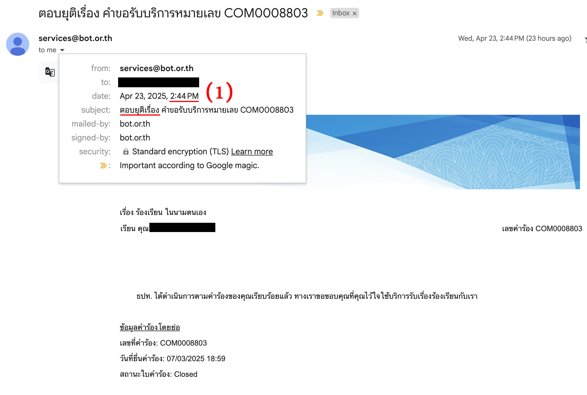(1) อีเมล์ "แจ้งเตือนก่อนปิดคำร้อง" และ "ตอบยุติเรื่อง" ส่งมาพร้อมกัน-ในวินาทีเดียวกัน ท่านลองนึกถึงระบบเตือนกะระยะถอยหลังของรถยนต์ หากรถคันใดเตือนปี๊บเดียวแล้วชนทันที ท่านคิดว่ารถคันนั้นผิดปกติหรือไม่