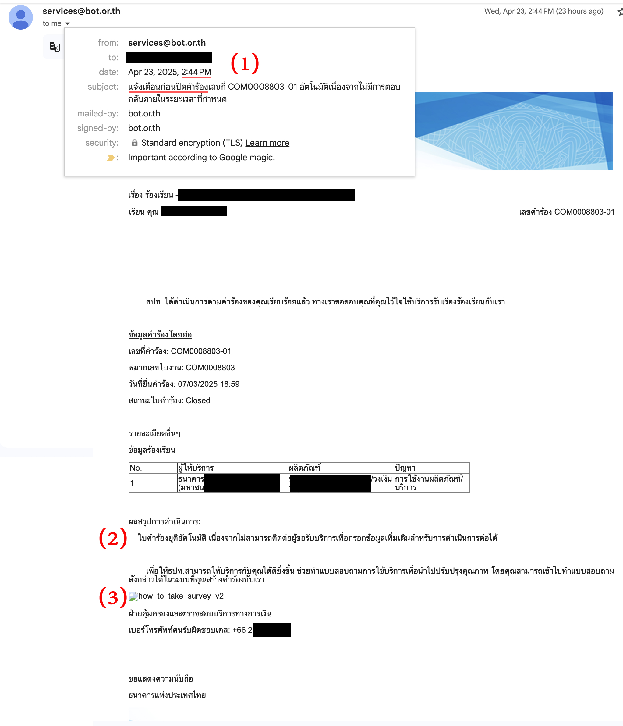 (2) "ใบคำร้องยุติอัตโนมัติ เนื่องจากไม่สามารถติดต่อผู้ขอรับบริการเพื่อกรอกข้อมูลเพิ่มเติมสำหรับการดำเนินการต่อได้" ทันทีที่ได้รับอีเมล์ฉบับนี้ ข้าพเจ้าได้โทรเข้าไปยังเบอร์ศัพท์ที่ระบุไว้ เจ้าหน้าที่แจ้งว่าเป็นข้อความจากระบบอัตโนมัติขณะนี้คำร้องยุติแล้ว