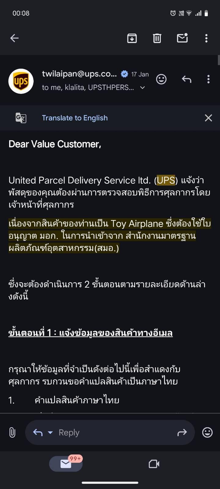พอของมาถึงไทย upsก็โทรมาบอกว่าของที่ผมสั่งมาอยู่ในหมวดหมู่toy airplaneซึ่งต้องการใบอนุญาติมอก.เพื่อนำเข้า แล้วupsก็ส่งemailมาบอกว่าถ้าให้จัดการให้ต้องเสียค่าธรรมเนียม3000บาท(มันบอกมาวิธีเดียว ใหม่บอกอะไรอย่างอื่นเลย)