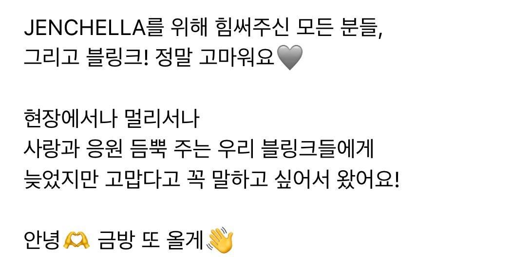 “ขอบคุณทุกคนที่ทำงานอย่างหนักเพื่อ JENCHELLA แล้วก็ BLINK! ขอบคุณมากนะคะ 🩶 ทั้งคนที่อยู่ในงานและคนที่อยู่ไกล ถึงบลิ้งค์ของฉันที่ได้มอบความรักและซัพพอร์ตฉันอย่างมากมาย แม้ว่าจะช้าไปแต่ฉันก็อยากมาบอกว่าขอบคุณค่ะ!