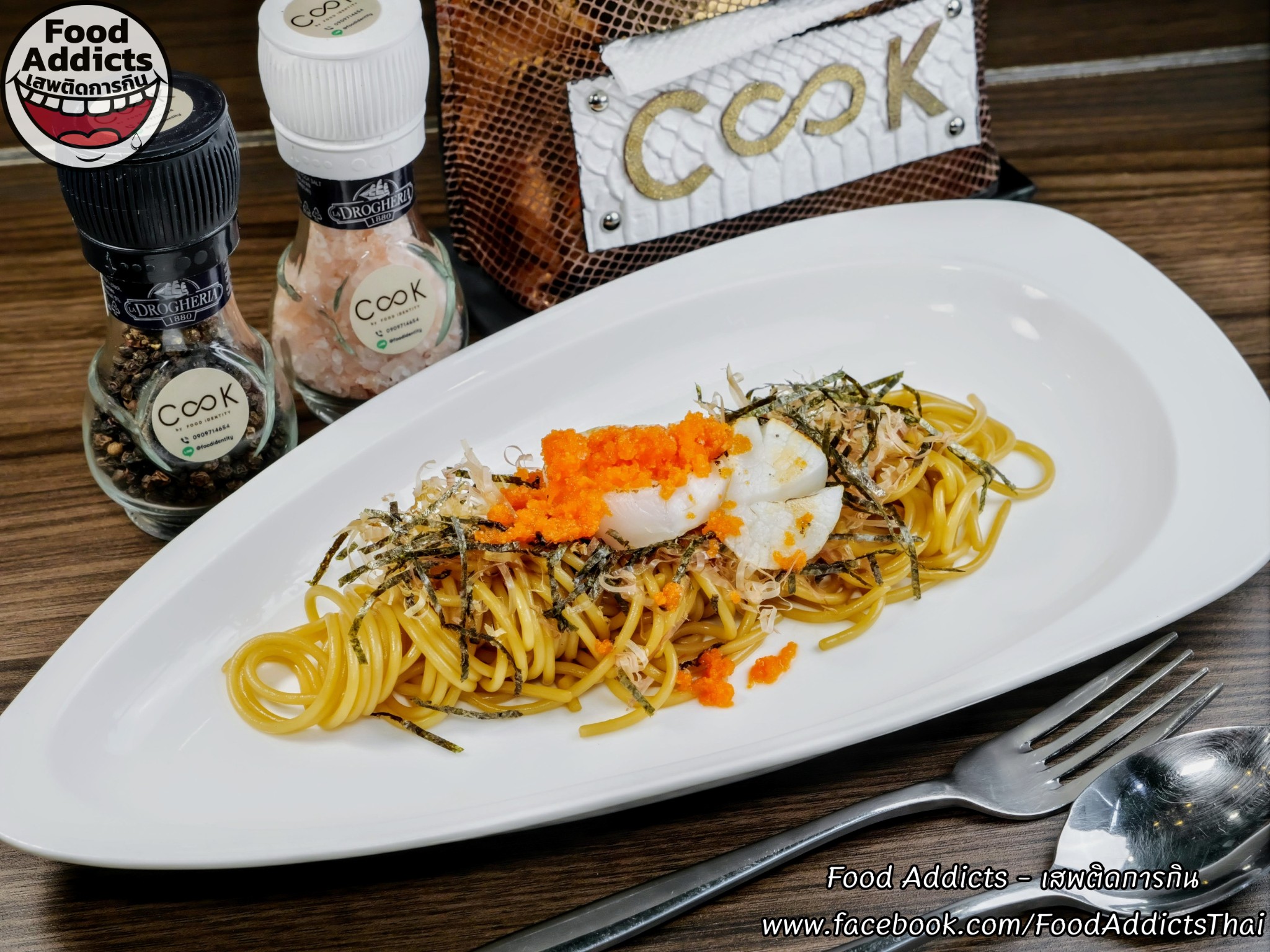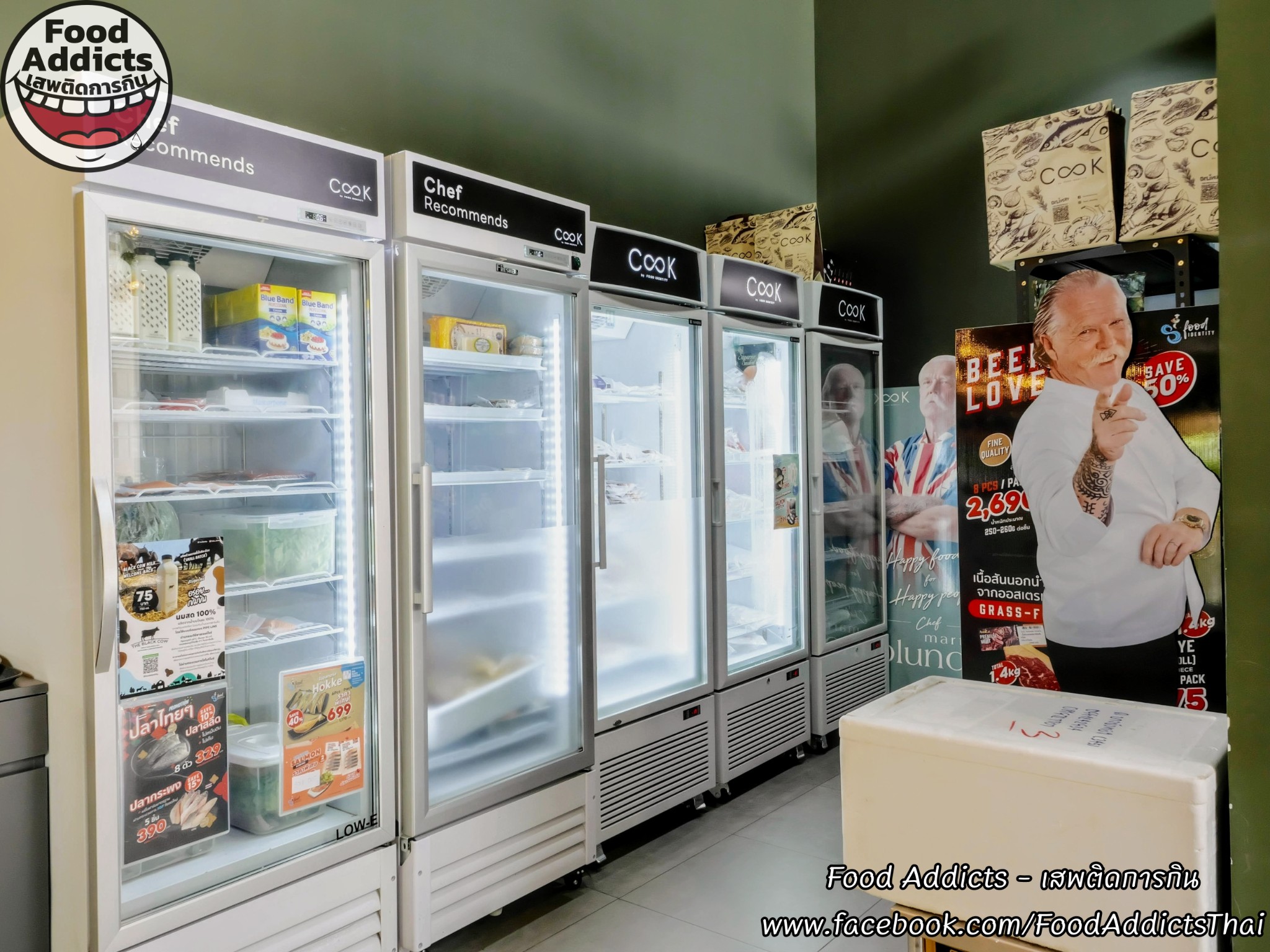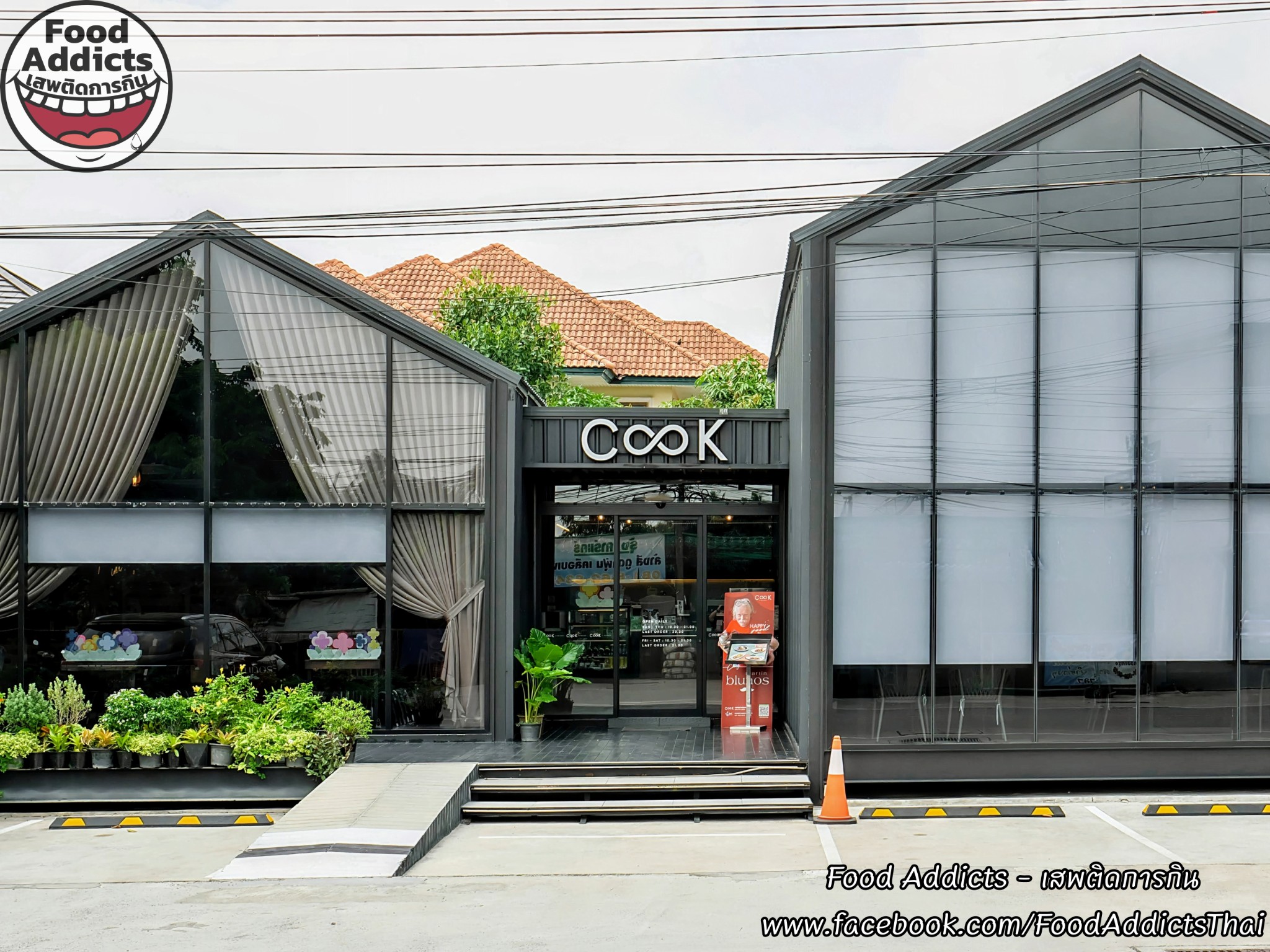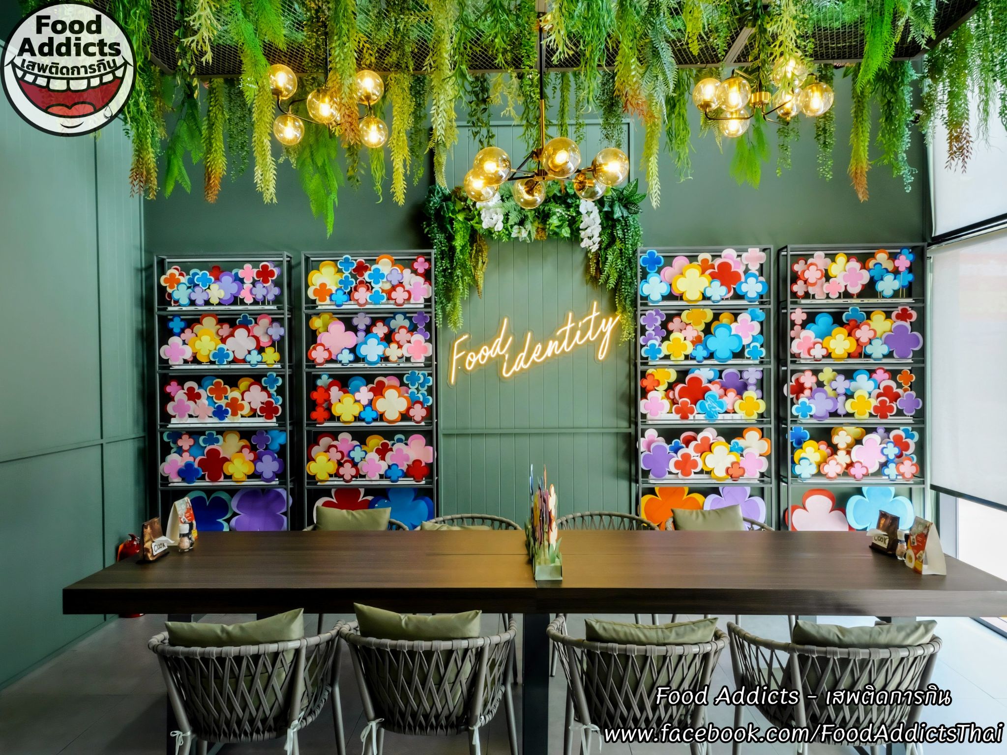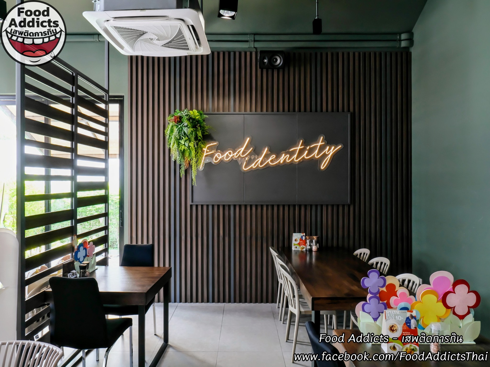 กดปุ่มผ่านประตูบานเลื่อนเพื่อเดินเข้ามาภายในร้าน "Cook By Food Identity" อาคารสูงสีดำสนิทแนวนอร์ดิกที่เห็นนั้นคือบ้านน็อกดาวน์สำเร็จรูปดีไซน์ทันสมัยจับต่อเรียงกัน ตกแต่งโดยปูพื้นด้วยแผ่นกระเบื้องเหมือนหินฝาผนังทาสีเขียวสไตล์เอิร์ทโทนเพดานสูงโปร่งติดตั้งระบบเครื่องปรับอากาศเย็นฉ่ำหน้าต่างกระจกใสขนาดใหญ่พิเศษช่วยปล่อยให้แสงแดดธรรมชาติคอยสาดส่องยาวตลอดวัน พร้อมเฟอร์นิเจอร์อีกหลายรูปแบบสามารถรองรับลูกค้าได้ตั้งแต่คู่รัก,ครอบครัวจนถึงกลุ่มเพื่อนฝูงประมาณ 2-10 ท่านถ้าจำนวนสมาชิกเยอะกว่านั้นขอแนะนำว่าโทรศัพท์แจ้งล่วงหน้าเพื่อปิดเหมาโซนจัดเลี้ยงโอกาสพิเศษต่างๆและครอบคลุมบริการถึง Pet Friendly โดยมีเงื่อนไขเพียงต้องบรรจุลงกระเป๋าหรือรถเข็นห้ามปล่อยลงเดินเล่น,ส่งเสียงดังรบกวนผู้อื่น ประดับโคมไฟโทนสีเหลืองแลดูอบอุ่นแขวนต้นไม้ห้อยระย้าสวยงามอลังการพอถึงช่วงเทศกาลสำคัญต่างๆของปีก็จะสลับเปลี่ยนเช่นวันนี้เป็นเหล่าดอกไม้กระดาษสีสันสดใสต้อนรับสงกรานต์ นอกจากรับประทานมื้อหลักอาหารอย่างจริงจังแล้วถ้าอยากดื่มกาแฟ,กินขนมหวานนั่งทำงานชิลๆใต้โต๊ะเราเห็นปลั๊กไฟกระจายเกือบทุกจุดสุดท้ายสายช็อปปิ้งต้องแวะซื้อวัตถุดิบสดใหม่คุณภาพระดับพรีเมียมบริเวณตู้แช่แข็งกลับไปปรุงต่อวางป้ายโปรฯลดราคาอีกมากมายต้องคอยติดตามบนเพจหลักครับผม