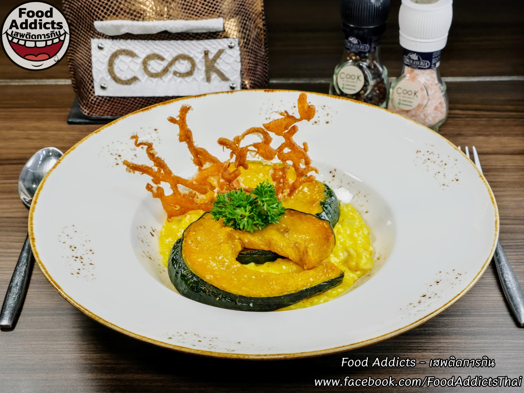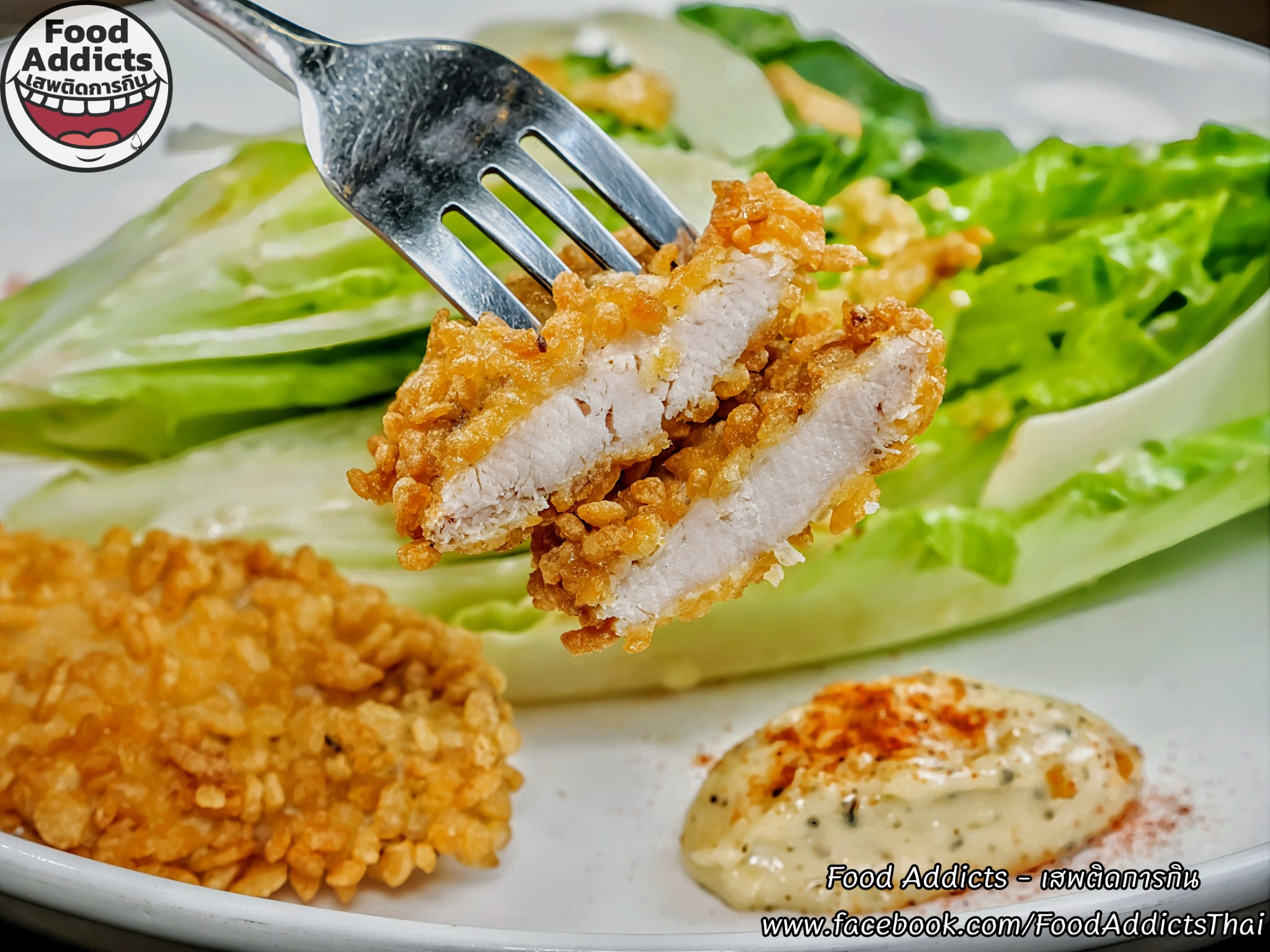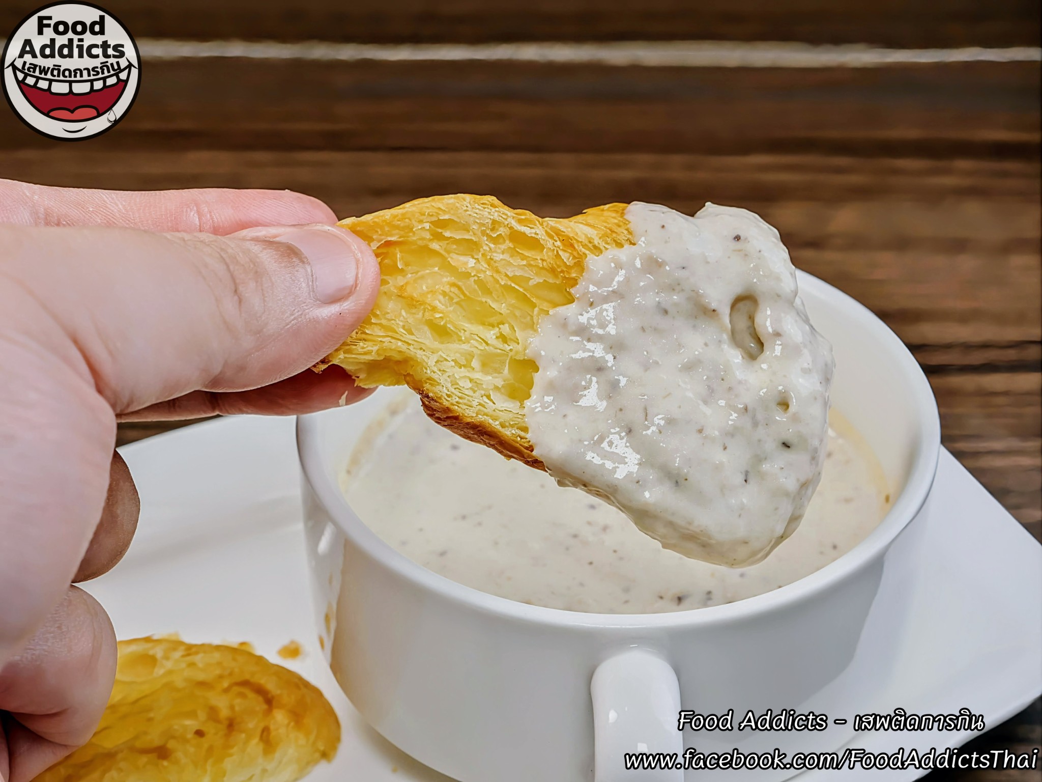 วันนี้ก่อนออกจากบ้านเปิดดูตารางบนเพจหลักแล้วเชฟ Martin Blunos (มาร์ติน บลูโนส) จะต้องแวะเข้ามาที่ร้าน "Cook By Food Identity" พอดีจึงแจ้งน้องพนักงานช่วยแนะนำเมนูพร้อมเสิร์ฟแบบเป็นคอร์สฉบับอังกฤษให้หน่อยเริ่มต้นกันด้วย "Mushroom Cream Soup" ราคา 145 บาท เลือกใช้เห็ดหลายชนิดผสมเข้ารวมกันจนมีกลิ่นรุนแรงซับซ้อนคล้ายทรัฟเฟิลผัดเนยจืดเพิ่มหอมหัวใหญ่,กระเทียม,วิปปิ้งครีมเข้าเครื่องปั่นจนเนื้อสัมผัสเหนียวหนืดเล็กน้อยปรุงแค่เกลือพริกไทยเรียบง่ายแต่อร่อยกลมกล่อมนัวละมุนเข้มข้น ต้องรับประทานคู่ขนมปังเพสตรี้อบกรอบฟองอากาศแทรกลักษณะเหมือนครัวซองต์ฝรั่งเศสเคลือบทุกอณูแตกสลายหายไปทันทีเมื่อเข้าปากชวนฝัน / "Caesar Salad With Crispy Chicken" ราคา 385 บาท หัวผักกาดคอสผ่าแบ่งครึ่งแบบยกทั้งต้นค่อยบรรจงทาน้ำสลัดซีซ่าร์สูตรคิดค้นเองทีละใบประดุจกระบวนการหมักกิมจิเกาหลีหันหลังเตรียมสะโพกไก่ฟาร์มอนามัยลอกหนังเพื่อเจียวรีดไขมันออก ส่วนเนื้อคลุกข้าวพองญี่ปุ่นทอดน้ำมันล้นควบคุมไฟระดับปานกลางประมาณ 180 องศาเซลเซียสสีเหลืองทองสวยงามจับประกอบร่างโดยทุบกากกรุบกรอบโรยด้านบนท็อปปิ้งพาร์เมซานชีสสไลซ์บางแผ่นใหญ่กับน้ำสลัดวางริมจาน วิธีกินต้องถือมีดให้กระชับมือหั่นผัก,จิ้มเนื้อสัตว์แตะซอสนิดหน่อยฟินสดชื่นทุกๆคำครับ