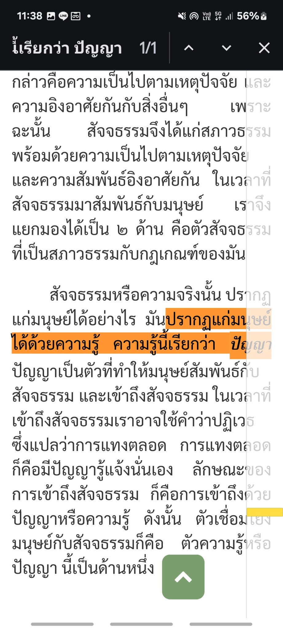 สัจจธรรมหรือความจริงนั้น ปรากฏแก่มนุษย์ได้อย่างไร มันปรากฏแก่มนุษย์ได้ด้วยความรู้ ความรู้นี้เรียกว่า ปัญญา ปัญญาเป็นตัวที่ทำให้มนุษย์สัมพันธ์กับสัจจธรรม และเข้าถึงสัจจธรรม ในเวลาที่เข้าถึงสัจจธรรมเราอาจใช้คำว่าปฏิเวธ ซึ่งแปลว่าการแทงตลอด การแทงตลอดก็คือมีปัญญารู้แจ้งนั่นเอง ลักษณะของการเข้าถึงสัจจธรรม ก็คือการเข้าถึงด้วยปัญญาหรือความรู้ ดังนั้น ตัวเชื่อมโยงมนุษย์กับสัจจธรรมก็คือ ตัวความรู้หรือปัญญา นี้เป็นด้านหนึ่ง