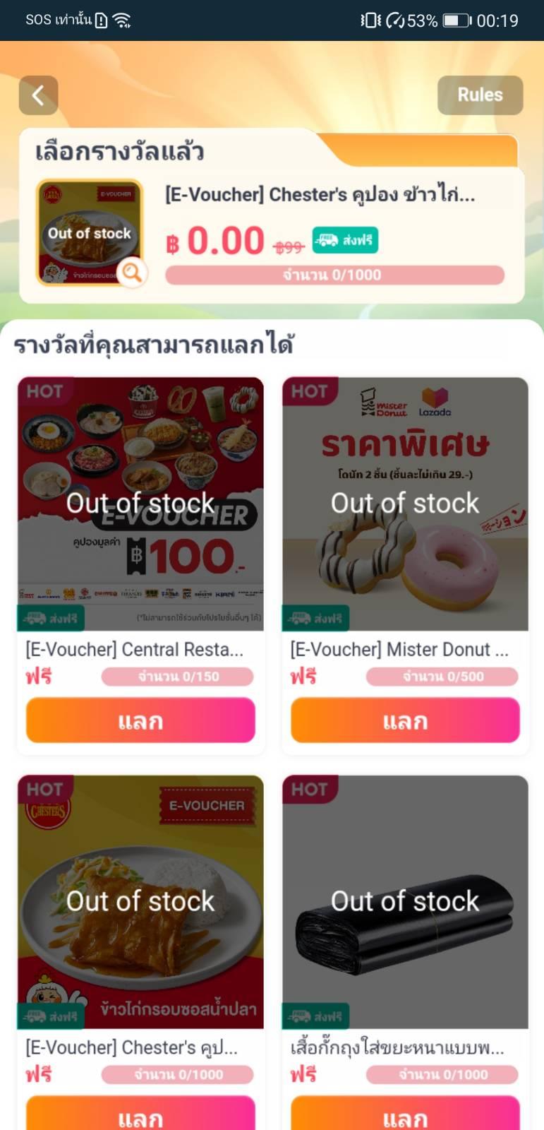 เราเล่นกิจกรรมจนครบแล้วพอกดเข้าแลกรางวัลในวันที่ 25 เมษายน กลับขึ้นว่า out of Stock ทุกรายการไม่สามารถกดแลกของรางวัลได้เลยจนหมดช่วงกิจกรรม