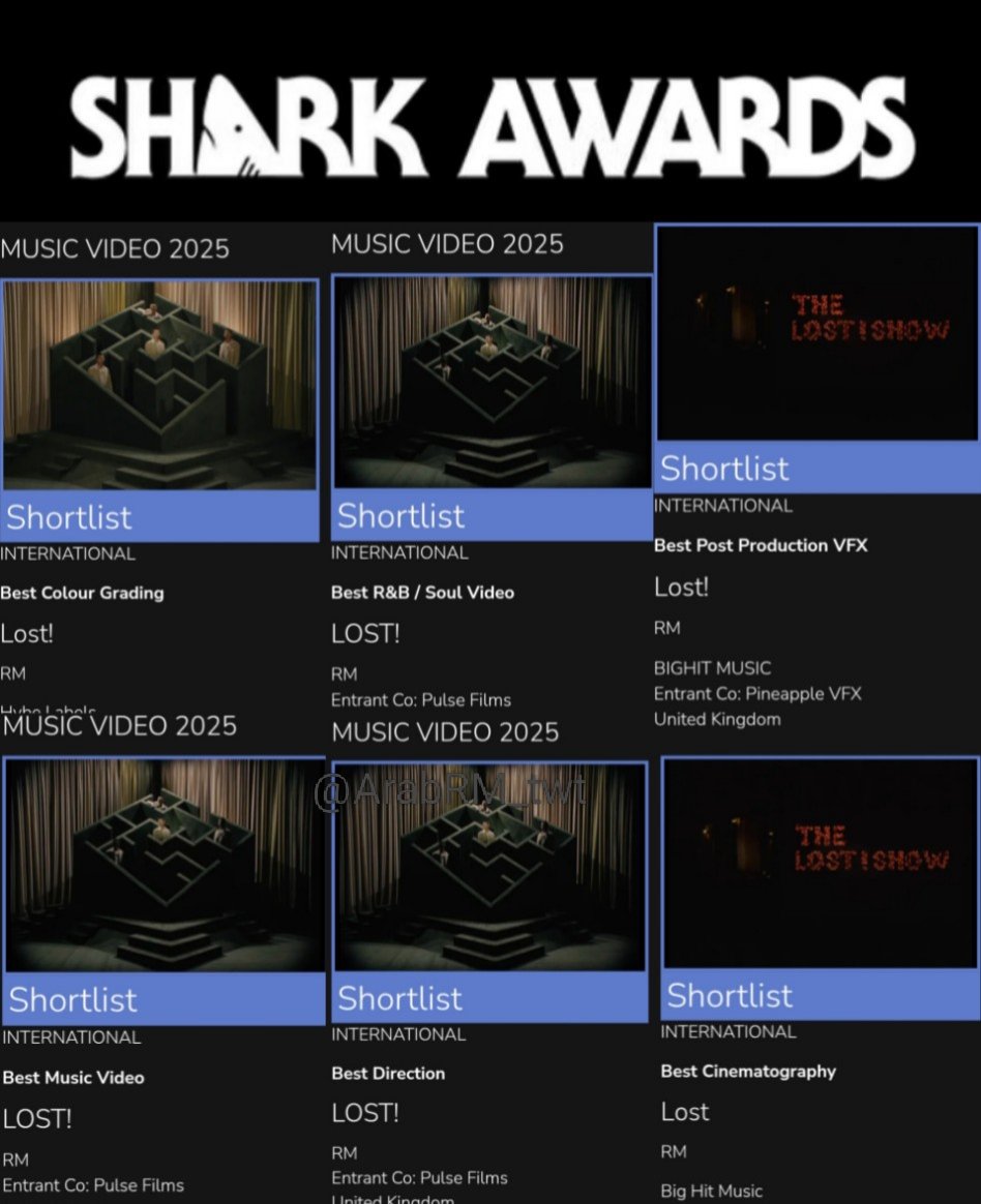 🎬 MV 'LOST!' by RM ได้รับเลือกเข้าชิงรางวัล 6 สาขา จากงาน Shark Music Video Awards 2025 ประเทศไอร์แลนด์