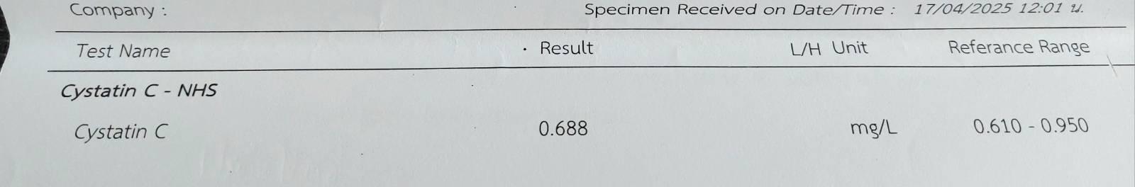 พอคุณหมออ่านผลตรวจ ก็ได้แจ้งกับผมว่าจริงๆแล้วพอคำนวณดู egfr จาก Cystatin c ผมได้ถึง 109 ด้วยซ้ำที่นี้ผมเลยลืมถามคุณหมอไป จนกลับมาถึงบ้านเลยอยากรู้ว่าค่าที่คุณหมอคำนวณมันคำนวณยังไงเหรอครับถึงได้ 109