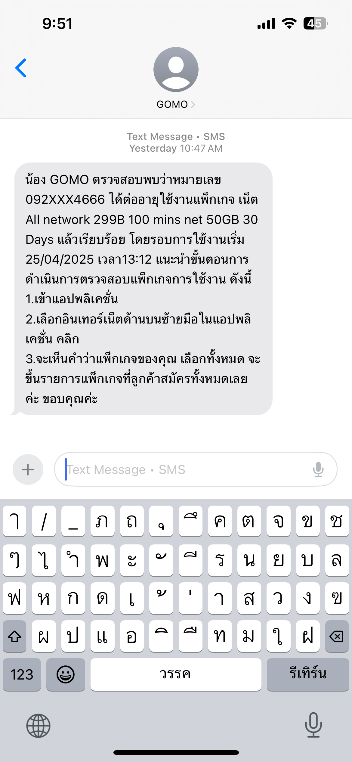 • GOMO แจ้งเตือนผ่าน Massage ว่า อีก 3 วันจะครบกำหนดจ่ายค่ารายเดือน อย่าลืมเข้ามากดจ่ายเงิน ก่อนใช้งานไม่ได้ ที่ https://gomo.th/app