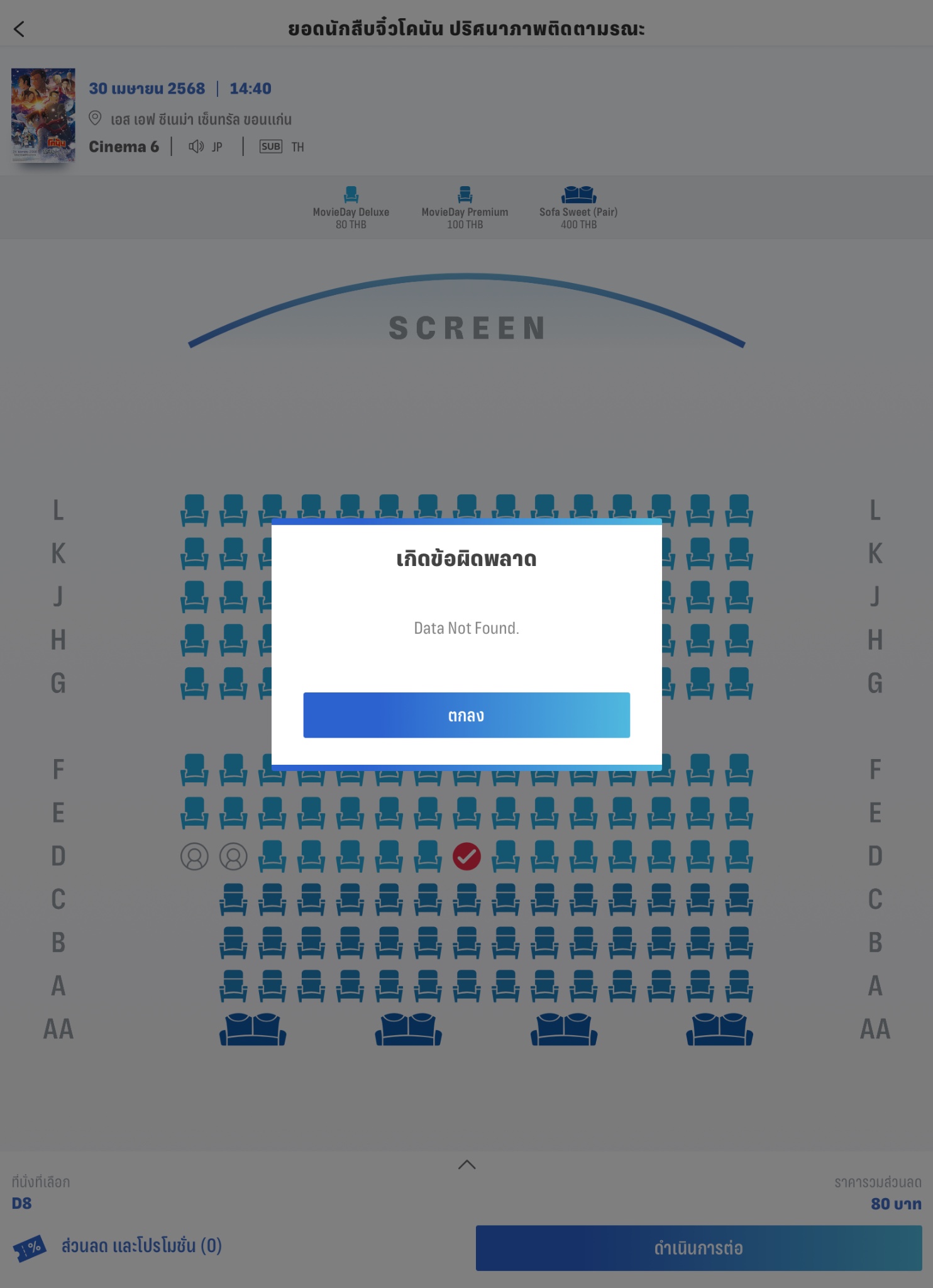 กดจองตั๋วหนังแล้วขึ้น data not found ตลอดเลยค่ะ😭😭😭