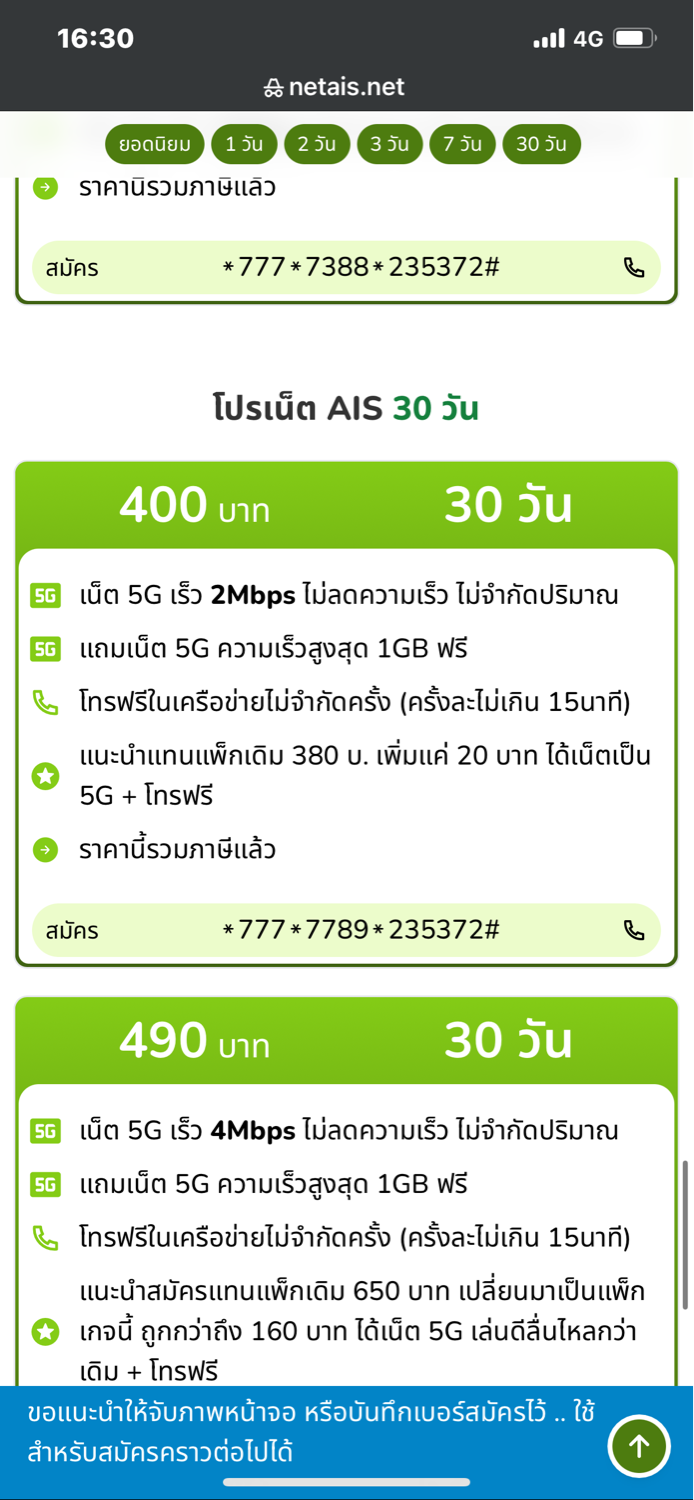 ตอนนี้ผมใช้แพ็กเกจ AIS 5G Max Speed 499 บาท/เดือน • เน็ตไม่จำกัดความเร็ว • โทรฟรี 250 นาที แต่เพิ่งมาเห็นว่ามีโปร 300 บาท/เดือน • ได้เน็ต 100GB (5G เต็มสปีด 20GB + เน็ตต่อเนื่องสูงส