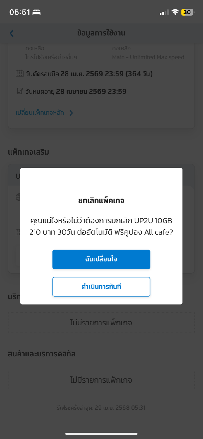 อยากยกเลิกแพ็คเกจหลักแพ็คเกจเสริมดีแทค แต่ยกเลิกไม่ได้