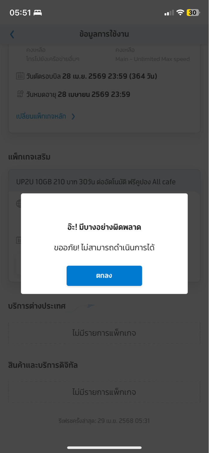 คือส่วนตัวใช้เน็ตรายเดือนอยู่แล้ว แต่จู่ ๆ ก็มีคนโทรมาแจ้งโปรบลา ๆ เราก็โอเคเปลี่ยนได้โปรไป แล้วก็มีแจ้งโปรเสริมมาด้วย แต่ตอนแรกเราเข้าใจว่ามันยกเลิกได้ตลอด แต่กลายเป็นว่าพอไปกดยกเลิกในแอป ที่ให้กดปุ่มถังขยะดันขึ้นว่าผิดพลาดอยู่ตลอด