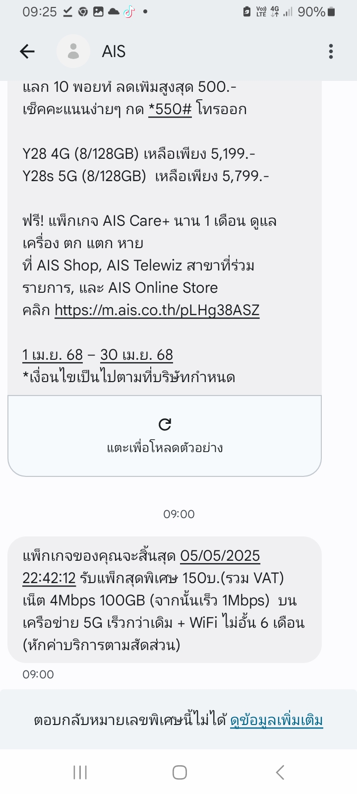 ได้รับข้อความจาก ais โปรais เน็ตคุ้มจุกๆ! AIS ให้คุณเล่นเน็ตที่ความเร็วสูงสูงสุด 5G จำนวน 25GB หลังจากนั้นเร็ว 10 Mbps ไม่มีลด พร้อม AIS SUPER WiFi Unlimited ไม่จำกัด เพียง 280บ. ต่อเดือน