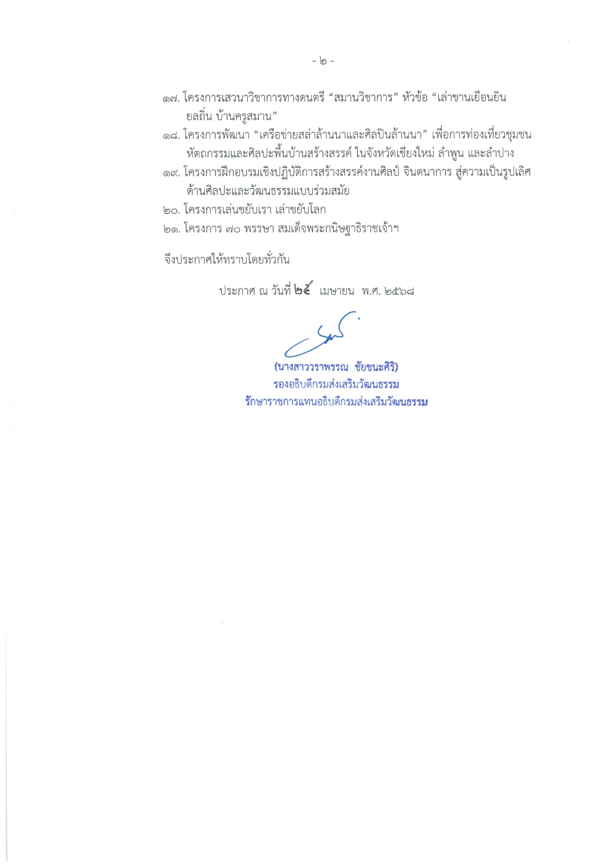 ประธานกรรมการกองทุนส่งเสริมงานวัฒนธรรม กล่าวอีกว่า สำหรับในปี 2568 กองทุนส่งเสริมงานวัฒนธรรม กรมส่งเสริมวัฒนธรรม มีผู้สนใจยื่นขอรับทุน 79 โครงการ ซึ่งคณะกรรมการกองทุนฯ ได้พิจารณาคัดเลือกโครงการเพื่อรับทุน ตามระเบียบคณะกรรมการกองทุนส่งเสริมงานวัฒนธรรม ว่าด้วยเงื่อนไขและรายละเอียดของโครงการหรือกิจกรรมที่ขอรับการอุดหนุนจากกองทุนส่งเสริมงานวัฒนธรรม พ.ศ. 2562 ครั้งที่ 1 ไปแล้วจำนวน 12 โครงการ เป็นเงิน 2,000,000 บาท (สองล้านบาทถ้วน) และในการประชุมครั้งนี้ เพื่อส่งเสริม สนับสนุน เผยแพร่การดำเนินงานด้านศิลปวัฒนธรรมของบุคคล คณะบุคคล องค์กรภาครัฐและเอกชน ทั้งในระดับท้องถิ่น ระดับชาติ และระดับนานาชาติ ภายใต้โครงการสนับสนุนการดำเนินงานด้านวัฒนธรรม ประจำปีงบประมาณ พ.ศ. 2568 ครั้งที่ 2 ได้พิจารณาคัดเลือกโครงการเพื่อรับทุน (เพิ่มเติม) อีกจำนวน 21 โครงการ ภายในวงเงิน 3,000,000 บาท (สามล้านบาทถ้วน) โดยมีศิลปินแห่งชาติ ทั้ง 3 สาขา ได้รับการสนับสนุน จำนวน 16 ท่าน ทายาทศิลปินแห่งชาติ ได้รับการสนับสนุน จำนวน 1 ท่าน หน่วยงานภาครัฐ ได้รับการสนับสนุน จำนวน 2 แห่ง และมูลนิธิฯ ได้รับการสนับสนุน จำนวน 2 แห่ง และจากรายละเอียดโครงการที่ได้รับทุน 21 โครงการ คาดว่าจะมีกลุ่มเป้าหมาย นักเรียน นักศึกษา เด็ก เยาวชน และประชาชนทั่วไปจากทั่วประเทศ ที่จะเข้าร่วมกิจกรรมมีทั้งในรูปแบบ Onsite และแบบ Online จำนวนไม่น้อยกว่า 156,830 คน อาทิเช่น