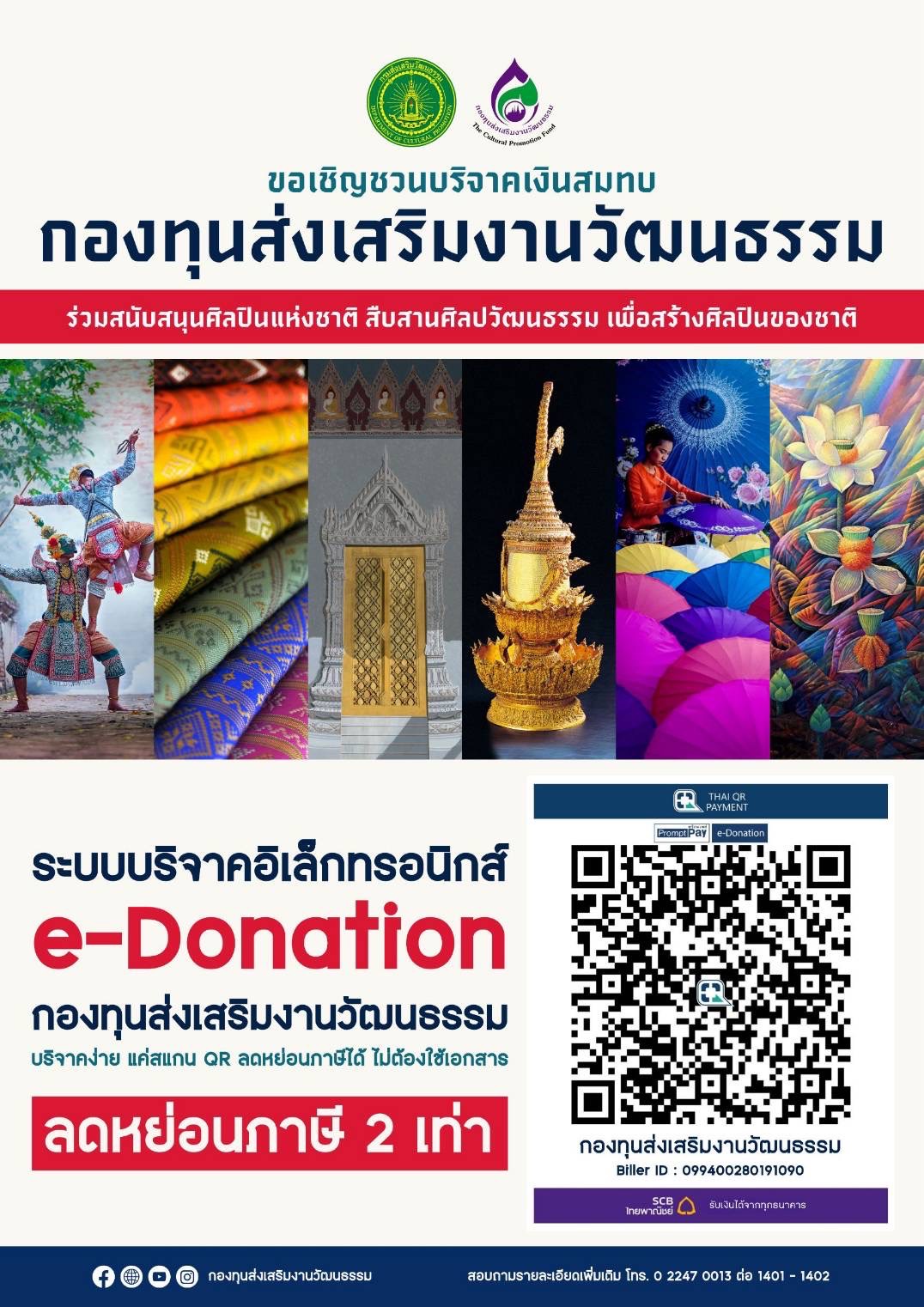 ในนามของประธานกรรมการกองทุนส่งเสริมงานวัฒนธรรม อยากจะขอเชิญชวนทุกท่านร่วมเป็นส่วนหนึ่งในการสนับสนุนการดำเนินงานด้านวัฒนธรรม สนับสนุนศิลปินแห่งชาติ สืบสานศิลปวัฒนธรรมของชาติ โดยการบริจาคเงินสมทบผ่านกองทุนส่งเสริมงานวัฒนธรรม สามารถบริจาคง่าย ๆ ด้วยตนเองเพียงสแกน QR Code โอนผ่านบัญชีธนาคารไทยพาณิชย์ สาขาถนนรัชดาภิเษก ชื่อบัญชี กองทุนส่งเสริมงานวัฒนธรรม เลขที่บัญชี 060-216511-7 หรือสามารถบริจาคด้วยตนเอง โดยเช็คสั่งจ่าย ในนามกองทุนส่งเสริมงานวัฒนธรรม นอกจากท่านจะเป็นผู้ร่วมสืบสานศิลปวัฒนธรรมของชาติแล้ว ท่านยังสามารถลดหย่อนภาษีได้ 2 เท่า อีกด้วย