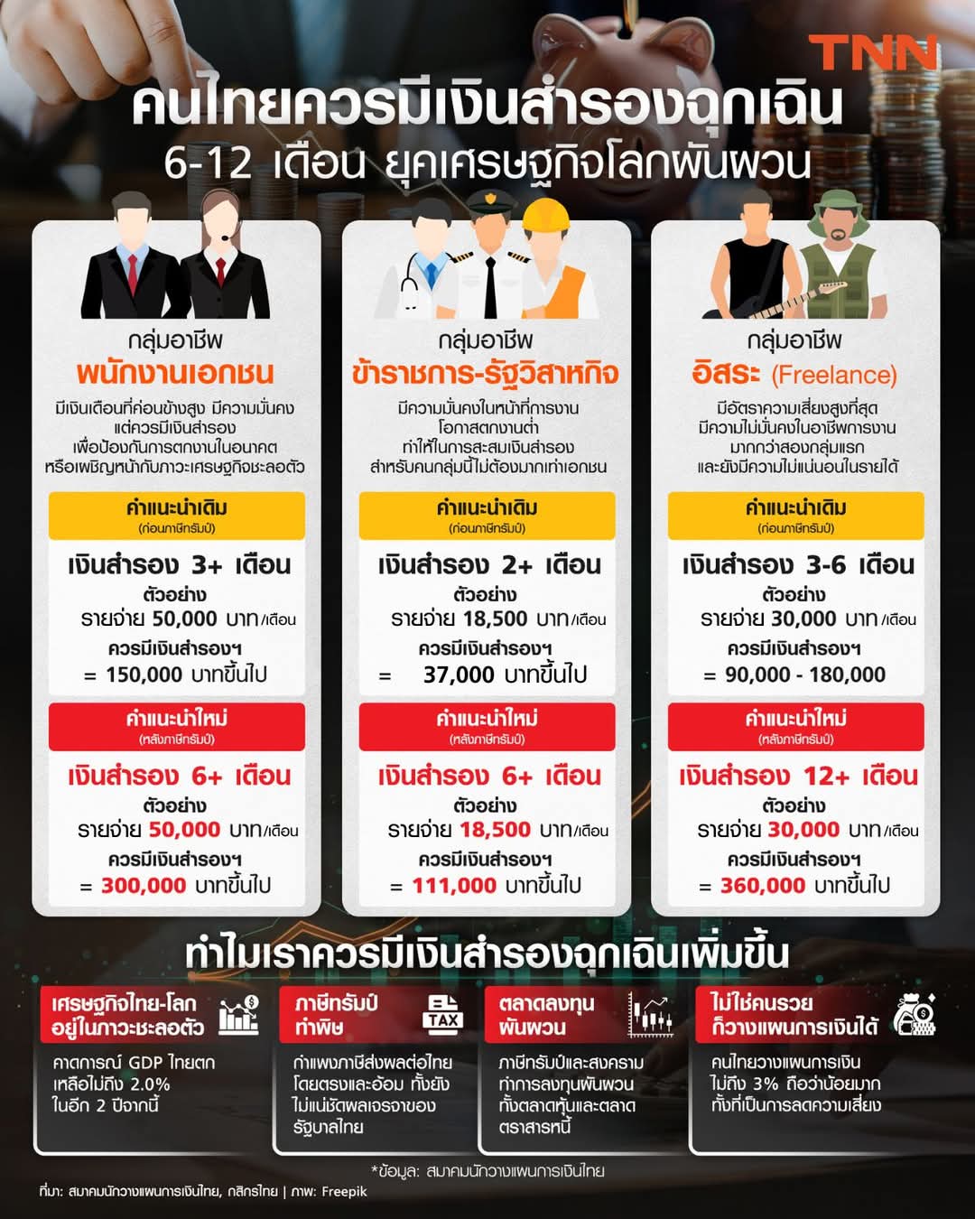 สมาคมนักวางแผนการเงินไทย ชี้ว่า ถึงเวลาที่คนไทยต้องมีเงินสำรองฉุกเฉินเพิ่มขึ้นแล้ว เพื่อรับมือความไม่แน่นอนเหล่านี้ จากเดิม 3-6 เดือน ต้องเพิ่มเป็น 6-12 เดือนแล้ว หรือเท่าตัวเลยทีเดียว