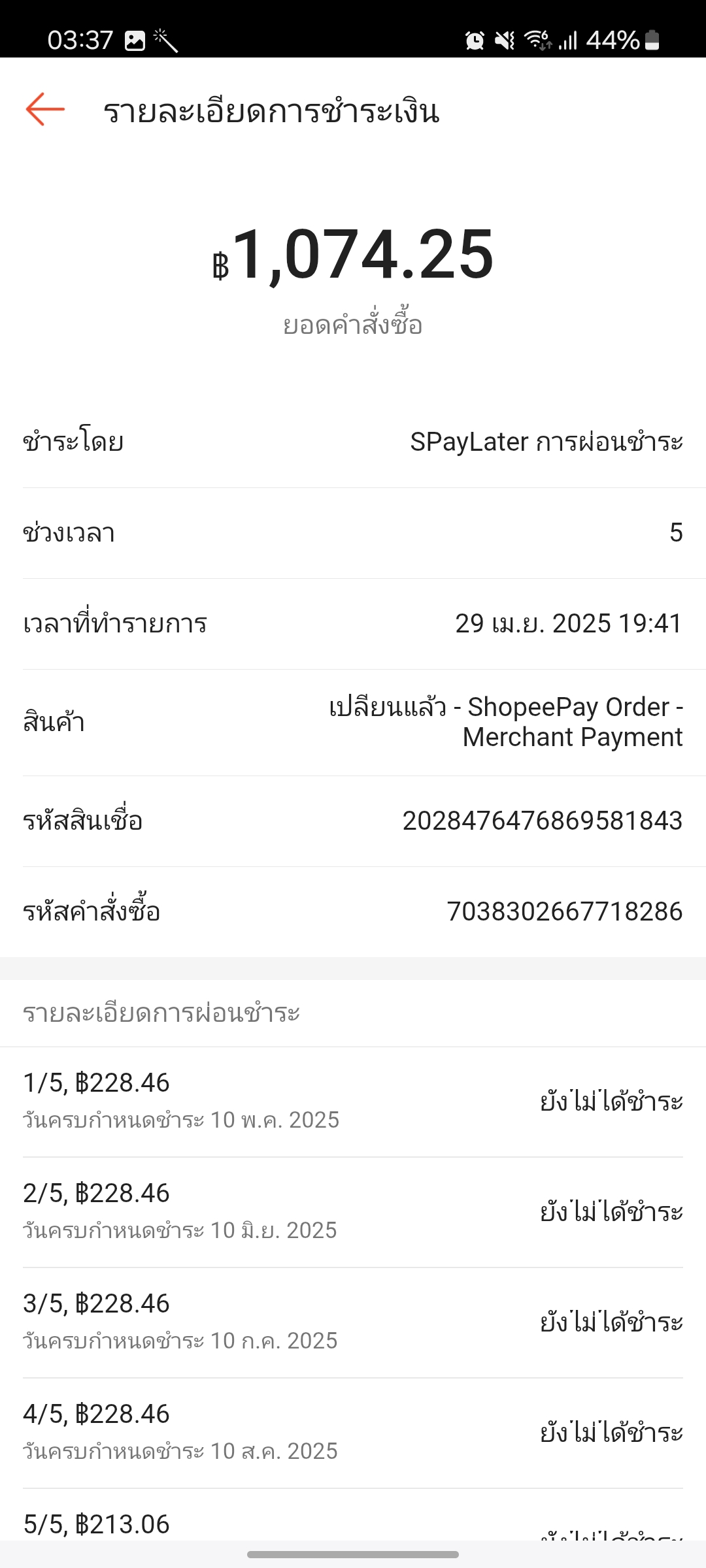 ขออนุญาตสอบถามค่ะ เราเปลี่ยนผ่อนชำระของช็อปปี้ของยอด1,074 เป็น5เดือน พอใกลเถึงวันครบกำหนดมันขึ้นรวมจ่ายหมดเลยค่ะของวันที