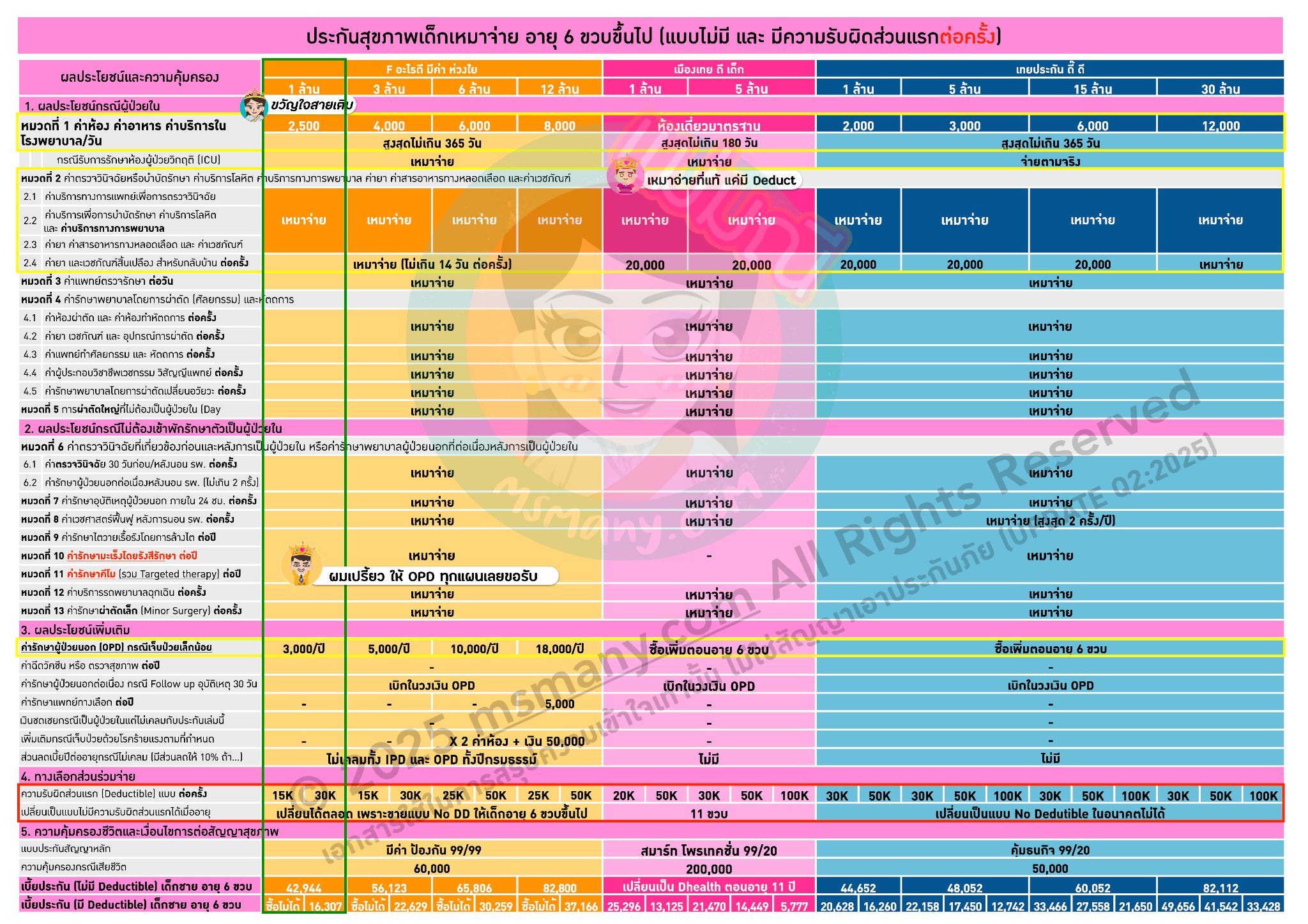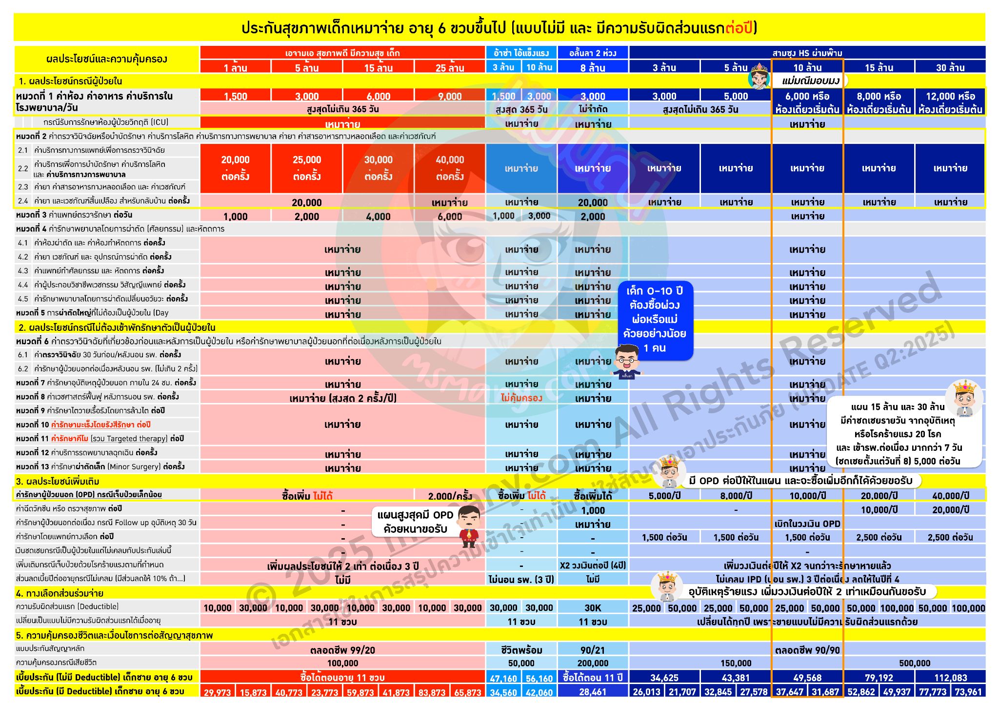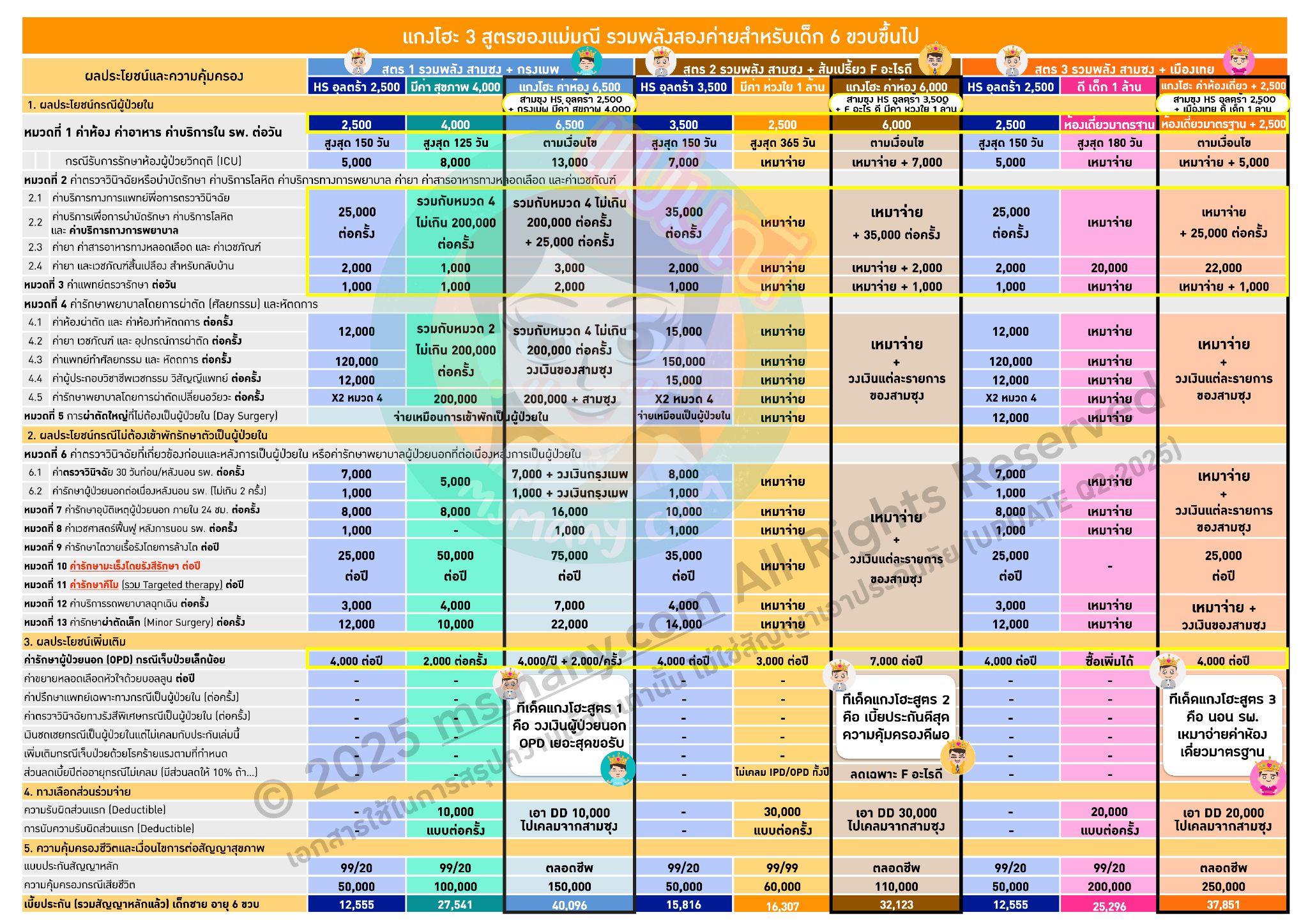 แม่มณีมีความยินดีที่จะแจ้งให้คุณผู้ปกครองทราบว่า ลูกท่านอายุครบ 6 ขวบแล้ว เริ่ดเว่อร์ หากลูกท่านไม่มีประวัติโรคเรื้อรัง หรือรุนแรงใด ๆ มีทางเลือกประกันสุขภาพมากมายให้ท่านเลือกสรร เรียงกัน 3 หน้า ตามระดับความโปรดปรานของแม่มณี แถมด้วยหน้าสุดท้ายแกงโฮะ 3 สูตรพิเศษจากแม่มณี ดังนี้เจ้าค่ะ