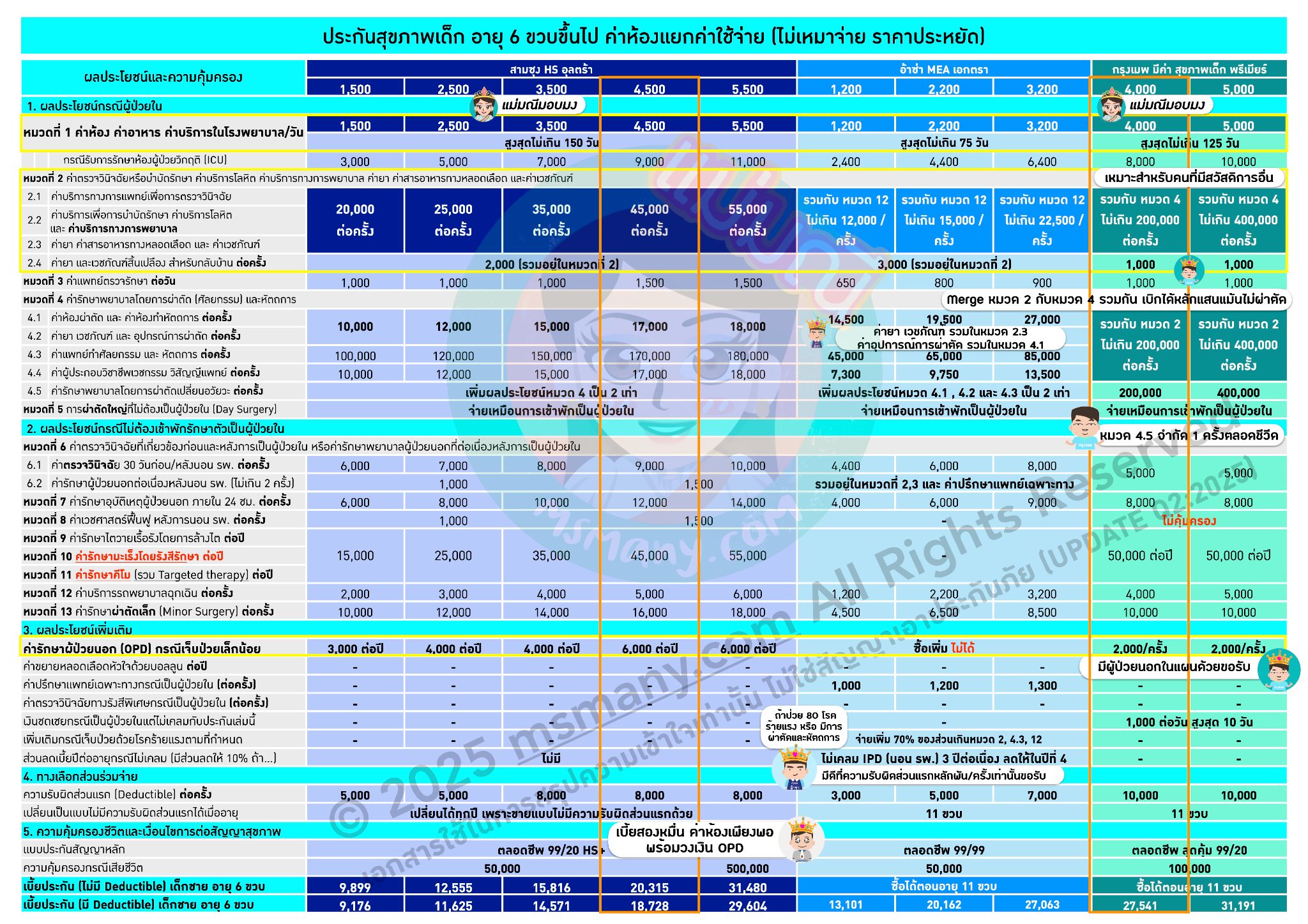 ส่วนใครที่รับได้กับทางเลือกแบบมีส่วนร่วมจ่าย Deductible แม่มณีอยากให้ลองมองขวา หาแผนประกันของกรุงเมพ ยักษ์ใหญ่รักเด็กไทยคนเก่ากันบ้าง ค่าห้อง 4,000 หมวด 2 กับ หมวด 4 จ่ายวงเงินรวมกันสองแสนต่อครั้ง แถมด้วย OPD 2,000 ต่อครั้งอีกด้วย แผนนี้คุ้มค่าอย่างยิ่งสำหรับคนที่มีสวัสดิการเดิมอยู่บางส่วน พอที่จะจ่าย Deductible 10,000 ต่อครั้งได้ วงเงินหมวด 2 หลักแสนจะสู้ไหวในเคสเด็กส่วนใหญ่แม้จะนอน รพ. หลายวัน และยังได้วงเงิน OPD 2,000 ต่อครั้งด้วยเจ้าค่ะ