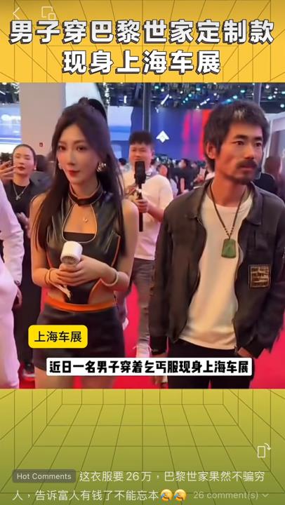 เมื่อวันที่ 28 เมษายน 2568 ท่ามกลางบรรยากาศหรูหราและนางแบบสาวสวยในงานมหกรรมรถยนต์ในนครเซี่ยงไฮ้ ชายคนหนึ่งกลับปรากฏตัวโดยสวมเสื้อยีนส์ขาดๆ กางเกงธรรมดา และรองเท้าเก่าๆ ดูเหมือนคนหลงเข้ามาในพื้นที่ที่เต็มไปด้วยความหรูหรา