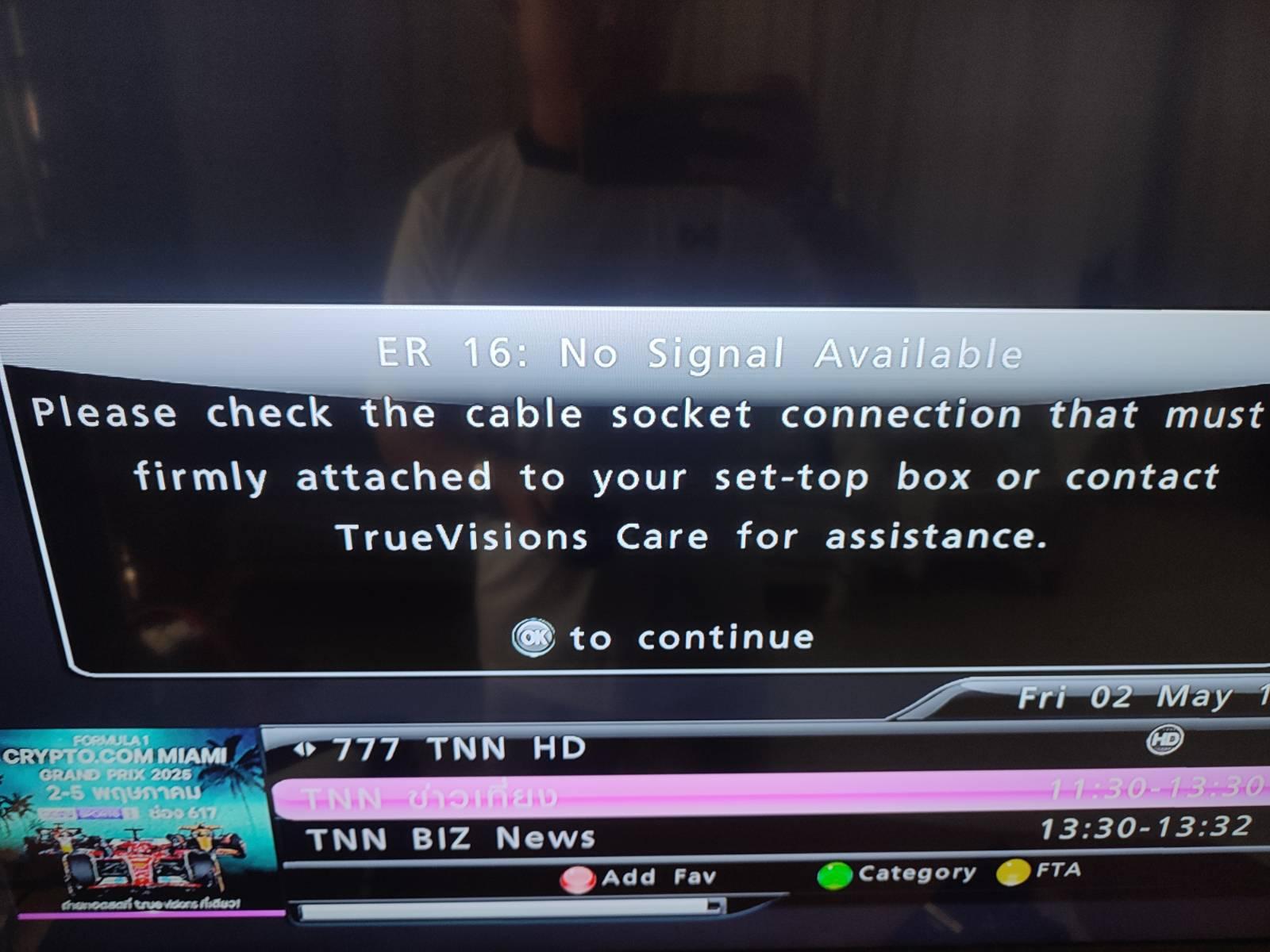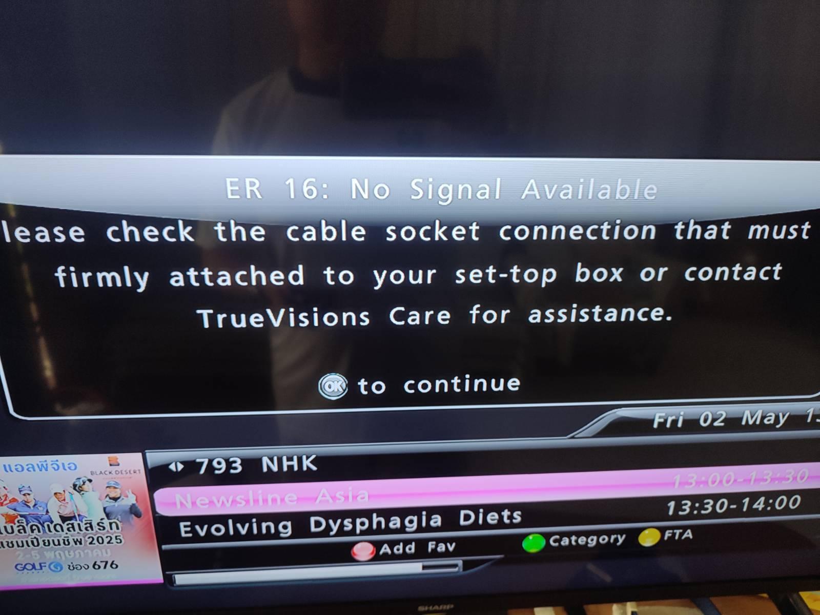บ้านผมใช้เคเบิ้ลทีวีทรูวิชั่นส์ เมื่อวานฝนตก มีอาการแปลกๆ เสียงดังผิดปกติ วันนี้เช้า เปิดมาเหลือแค่ช่องฟรีทีวี 4-5 ช่อง ขนาด TNN16 ยังerror code ER16 No signal available