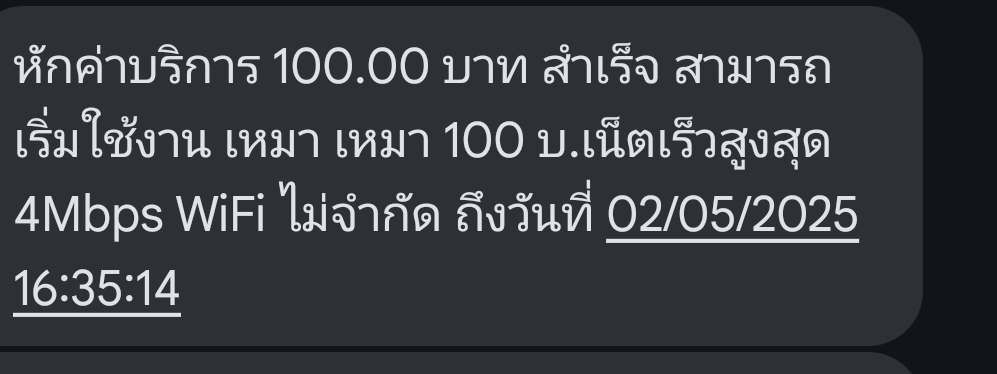 เรื่องมีอยู่ว่าผมใช้แพ็คเน็ตแพคนึงอยู่เป็นประจำครับคือแพ็ค" เหมา เหมา 100 บ.เน็ตเร็วสูงสุด 4Mbps WiFi ไม่จำกัด "วันนี้เป็นวันหมดการใช้งานและคิดค่าบริการในวันเดียวกันซึ่งผมได้เติมเงินไปแล้ว100บาท มันก็ไม่หักค่าบริการให้ ช่วยผมด้วยครับ ขอให้ช่วยกลับมาใช้ได้ครับไม่ได้อยากใช้แพ็คใหม่ๆหรือแพคอื่น