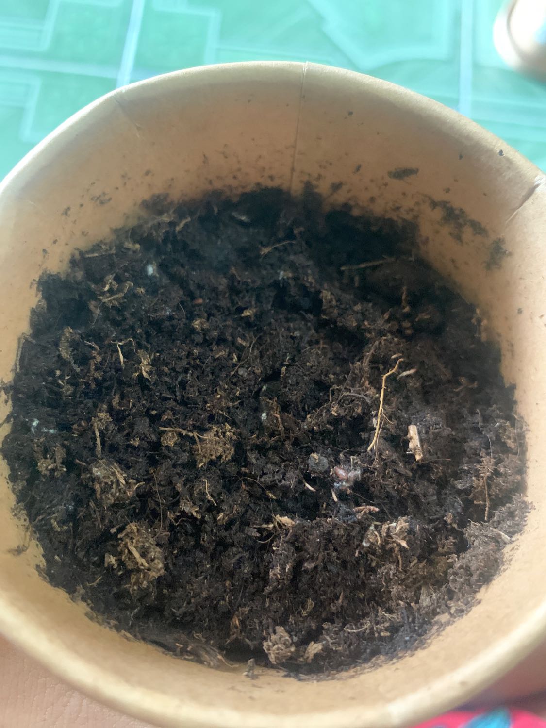 ตอนแรกจะเอาลงดินที่ซื้อมาถุงๆ จะปลูกในกระถางค่ะ แต่เป็นดินใหม่เลยเอาดินไปผสมกับขี้วัวก่อนแล้วเอาดินตากแดดไว้ กลัวว่าเมล็ดจะไม่งอก เลยเอามาเมล็ดมาเพาะบนกระดาษทิชชู่ดูก่อน ให้งอกชัวร์ๆ แล้วว่าค่อยเอาลงด