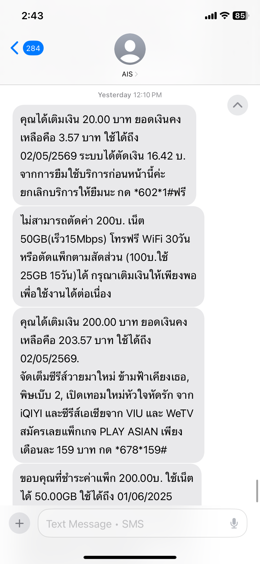 สวัสดีค่าไม่ทราบว่าตอนนี้ทาง AIS หักเงินค่าอะไรหรอคะ เนื่องจากเมื่อวันที่ 2 พฤษภาคม 2568 เราเพิ่งชำระยอด“ยืมใช้บริการ”ซึ่งเราไปยืมตอนไหนทางเรายังไม่ทราบเลยค่ะแต่ก็ไม่เอะใจจึงเติมจ่ายไป 20 บาท (ในตอนแรก-16.42 พอชำระไป 20 บาทเราจึงต้องเหลือ 3.57) แต่พอมาวันนี้วันที่ 3 พฤษถาคม 2568 เราได้เข้าไปดูในแอพ myAIS เรากลับติดลยเพิ่มเป็น -17.82 ซึ่งระยะเวลามันเพิ่งผ่านมาได้แค่ 2-3 วันแต่เรางงมากว่ามาหักค่าอะไรเพราะเราไม่ได้โทรหาใครอีกทั้งอยู้แต่บ้านใช้ wifi ค่ะ เลยอยากถามทาง AIS ว่าแบบนี้เรียกว่าหลอกลวงเอาเงินผู้ใช้งานไหมคะ งงมาก รบกวนคืนด้วยค่ะ และจัดการระบบอย่าให้มาหักเราอีกด้วยนะคะ มันไม่งามค่ะ (เราไม่เคยเริ่มขอยืมเงินคุณเลยค่ะ รบกวนอย่าขอยืมเองด้วยนะคะ เพราะเราไม่เคยคิดจะขอ)