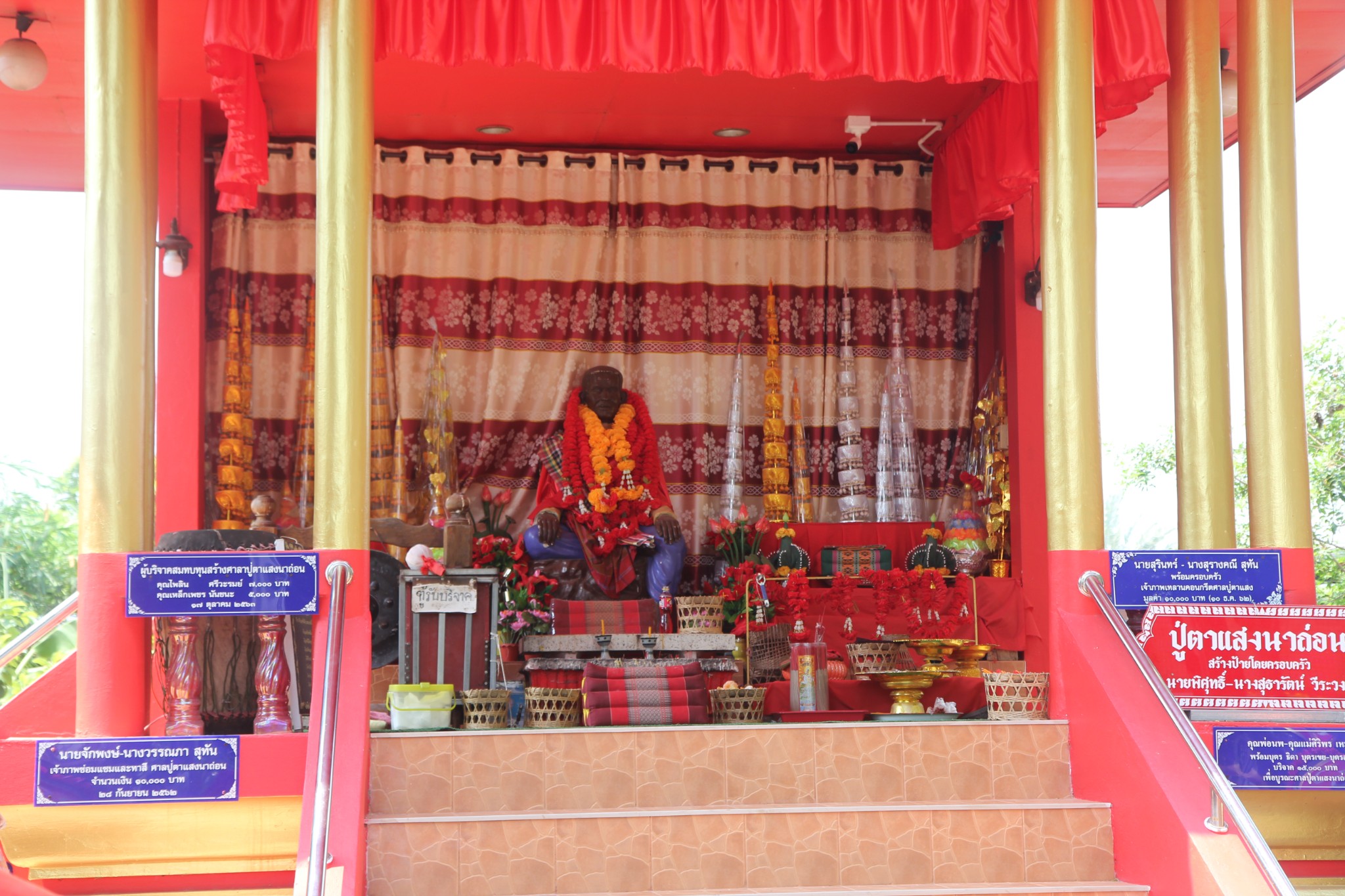 เริ่มต้นการท่องเที่ยวในชุมชนบ้านนาถ่อนด้วยการสักการะ ศาลปู่ตาแสง ซึ่งเป็นที่เคารพของคนในชุมชน และได้รับการต้อนรับจากเจ้าที่ที่คอยดูแลการท่องเที่ยวเชิงวัฒนธรรมของชุมชนบ้านนาถ่อน ซึ่งเป็นชาวบ้านในหมู่บ้านนาถ่อนพัฒนาค่ะ