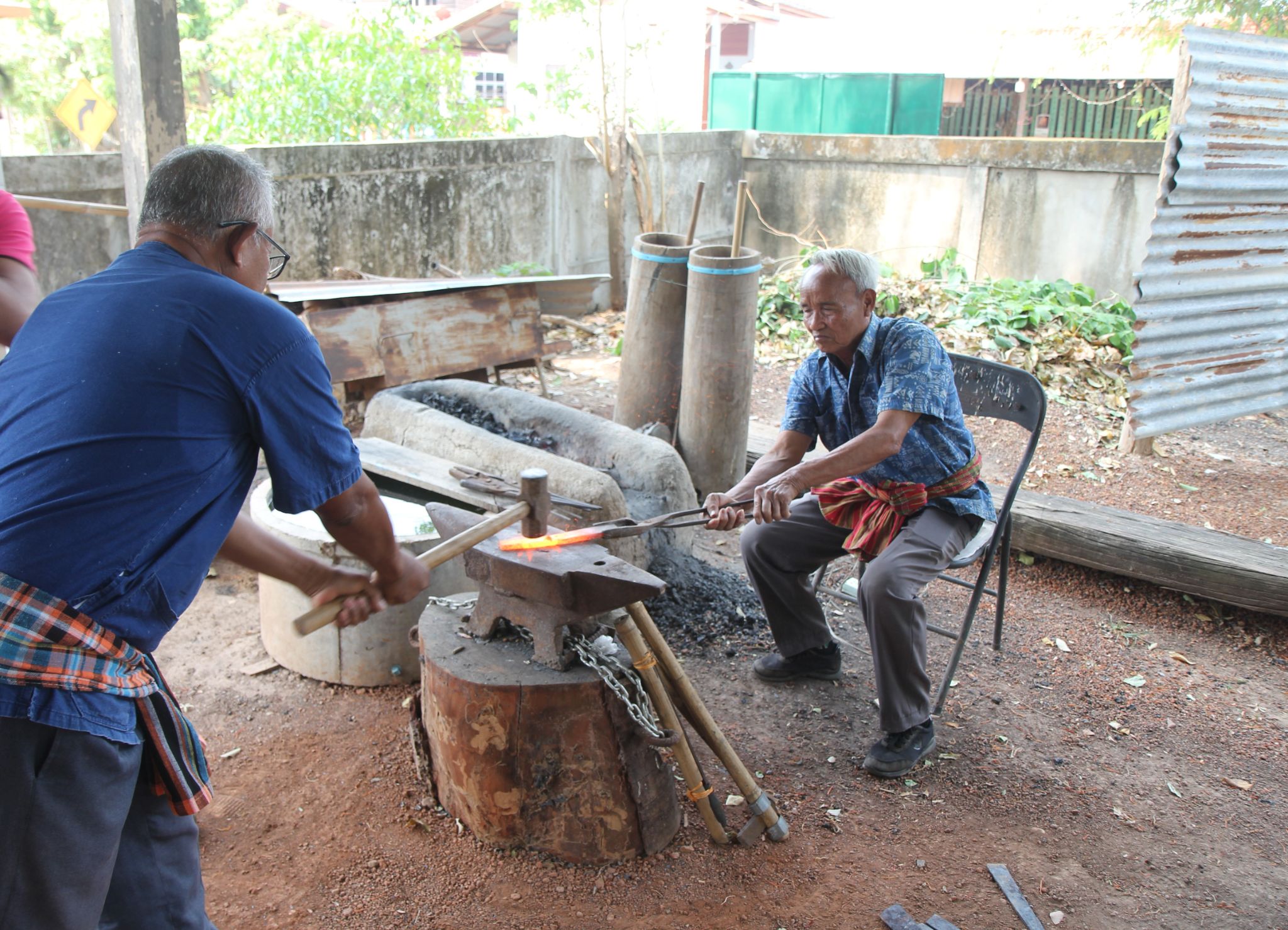 จากนั้นเราได้พูดคุยกับชาวบ้านที่มีความรู้ด้านการตีเหล็กค่ะ และได้รับการให้ความรู้วิธีการตีเหล็กแบบดั้งเดิม ซึ่งถือว่าเป็นภูมิปัญญาของคนในชุมชน และยังได้ทดลองตีเหล็กด้วยตัวเองด้วย ซึ่งยากกว่าที่คิดเพราะต้องใช้แรงเยอะมากๆและต้องใช้ความเคยชินในการตีด้วย