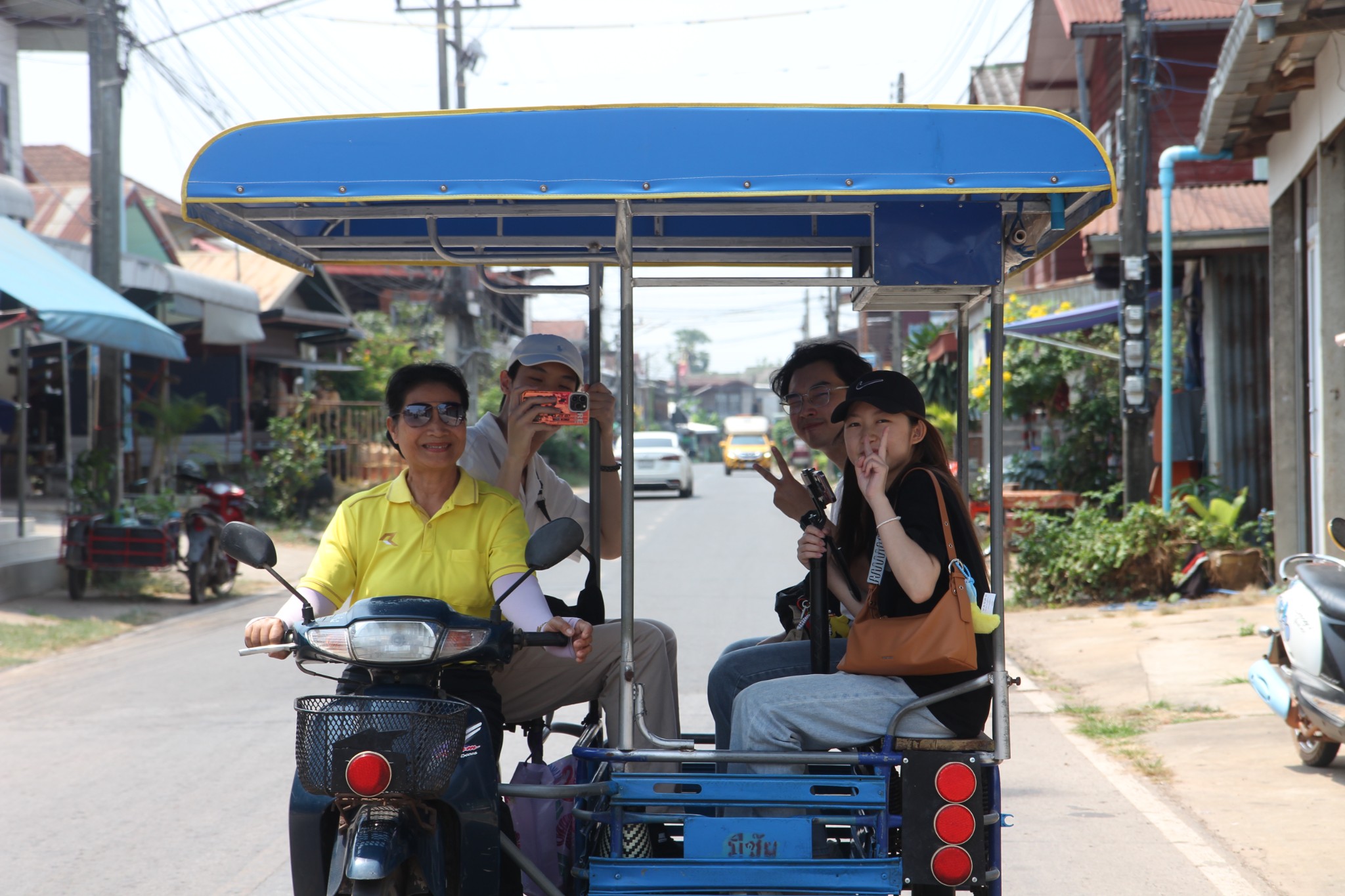 จากนั้นนั่งรถมอเตอร์ไซต์พ่วงข้างรับลมชมวิวหมู่บ้านนาถ่อนเพื่อไปดูการตีเหล็กแบบสมัยใหม่