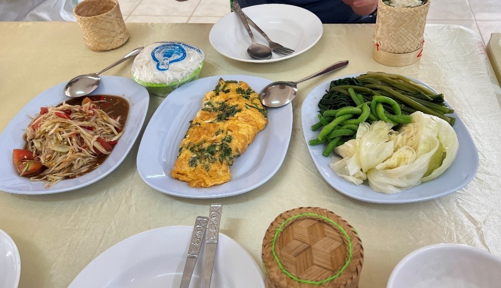 หลังจากสักการะพระธาตุมรุกขนครแล้ว เราได้เดินทางกลับไปวัดศรีมงคลเพื่อทานอาหารกลางวันค่ะ โดยอาหารกลางวันจะถูกทำโดยเจ้าหน้าที่ในชุมชนที่ดูแลเรื่องการท่องเที่ยวเชิงวัฒนธรรม เริ่มต้นจากอาหารทานเล่น จะมีน้ำเปล่า น้ำอ้อยสด ขนมใส่ไส้ ข้าวต้มมัด ส่วนอาหารเที่ยงจะประกอบไปด้วย ไข่เจียว ส้มตำ ผักลวก ผัดผัก ต้มไก่ลาดใส่ใบบักขามอ่อน ขนมจีน ข้าวสวย ข้าวเหนียว แล้วแต่ว่าใครจะอยากกินอะไรเลย พี่ๆให้กับข้าวมาทั้งหมด 3 ชุดเลย นอกจากของคาวแล้วยังมีของหวานและผลไม้อีกด้วย ทั้งแตงโม มะยงชิดและรากบัวเชื่อมเป็นของหวานค่ะ