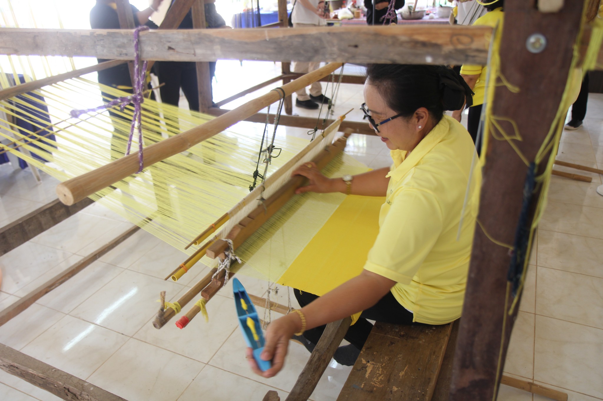 กินข้าวเสร็จแล้วก็ไปศึกษาวัฒนธรรมพื้นบ้านกันต่อ พี่ๆได้นำเสนอการทอผ้าค่ะ ซึ่งจะตรงตามสโลแกนของหมู่บ้านคือ “เสร็จหน้านา ผู้หญิงทอผ้า ผู้ชายตีเหล็ก“ เราได้ทดลองการทอผ้าด้วยเครื่องทอผ้าแบบเก่าที่ต้องใช้ประสบการณ์ และใช้ความประณีตในการทอเพื่อให้ได้ผ้าที่สมบูรณ์ เพื่อนำไปตัดเป็นชุดประจำชนเผ่าเพื่อนำไปใช้ใส่ในโอกาสต่างๆ จะบอกว่ามีเพื่อนๆที่ได้ลองทอผ้าด้วยนะ เผื่อใครอยากประลองความสามารถของตัวเองค่ะ