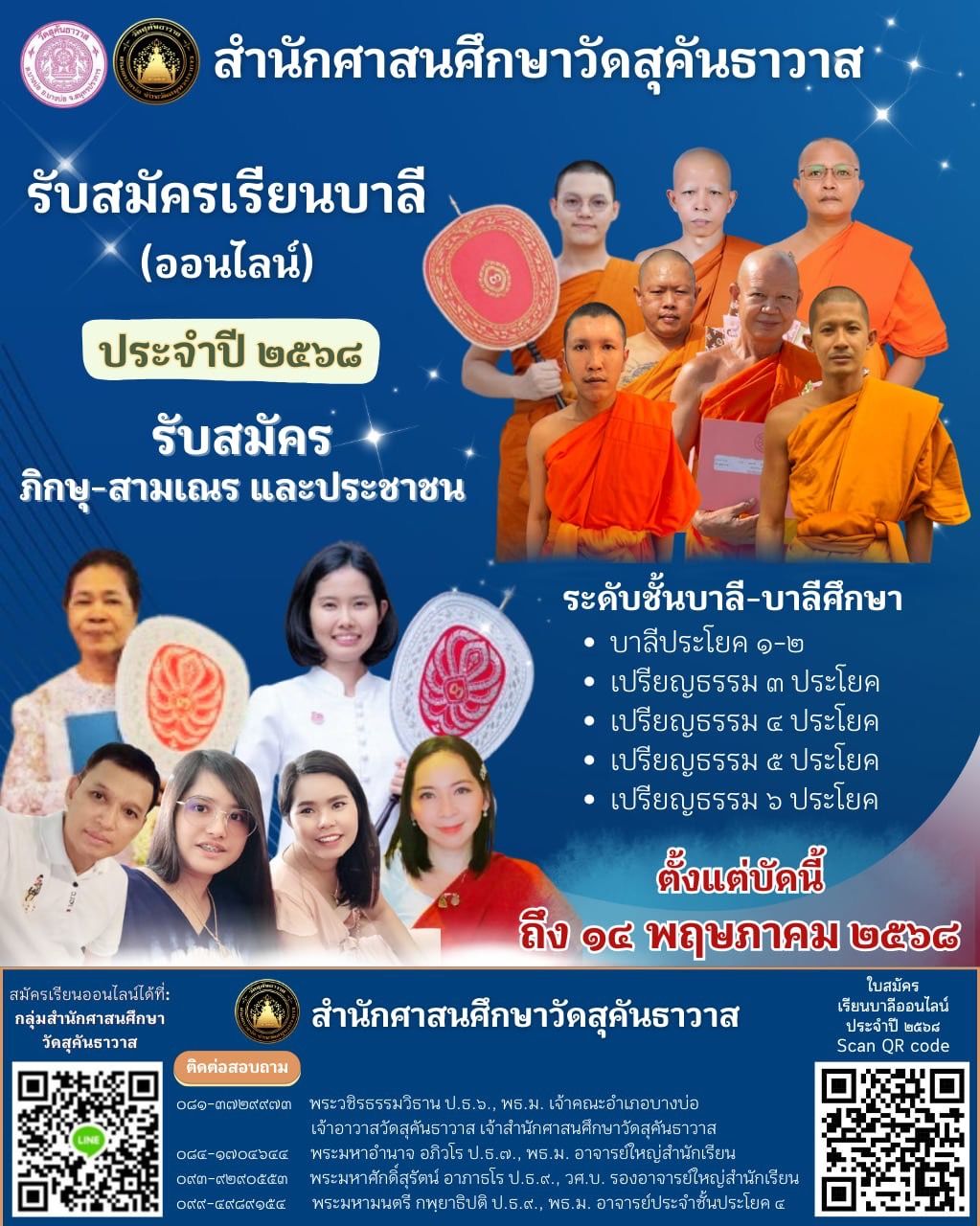 หมายเหตุ: รายชื่อผู้มีสิทธิ์เข้าเรียนบาลีและบาลีศึกษาออนไลน์ จะประกาศ ตั้งแต่วันที่ ๓ พ.ค. ๒๕๖๘ เป็นต้นไป โดยผ่านทาง ๒ ช่องทาง