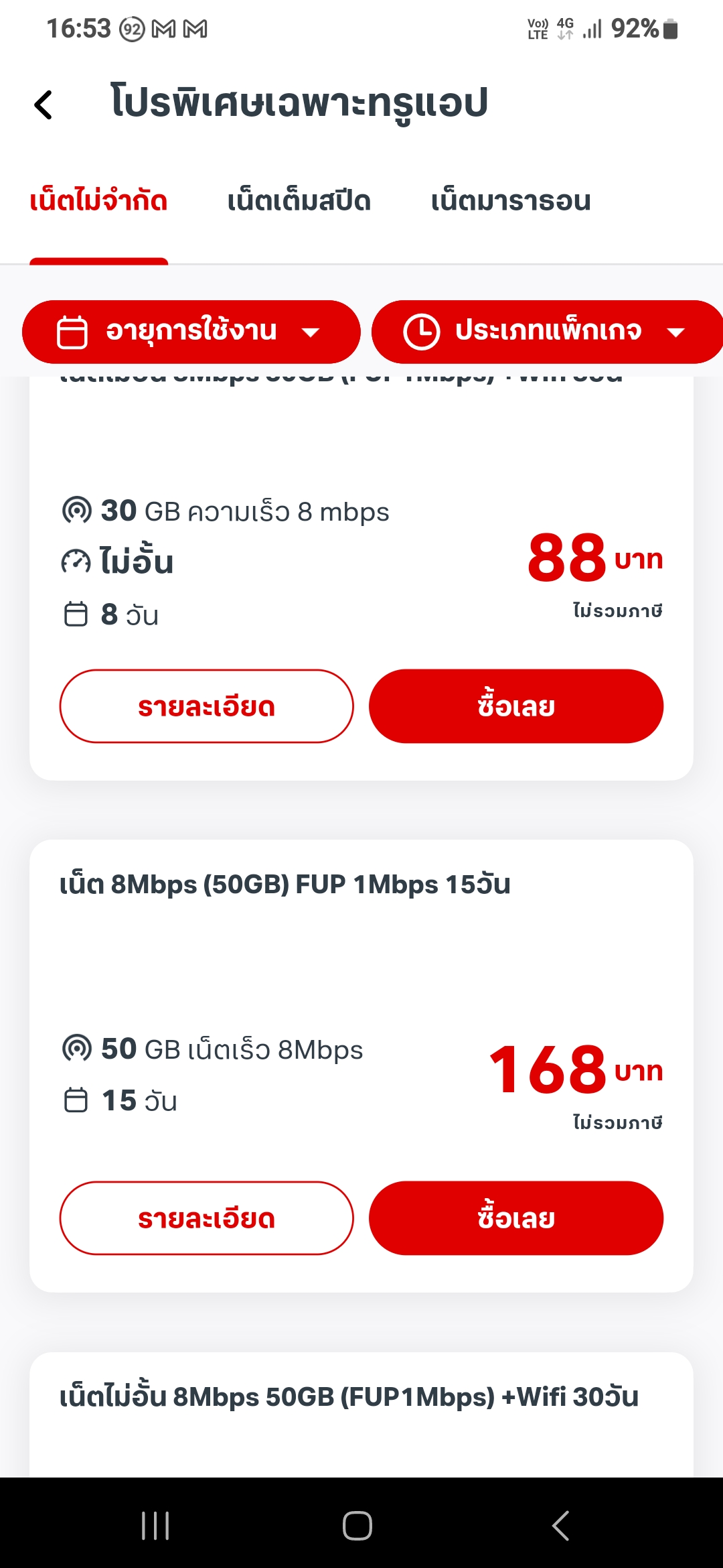 แพ็กเกจทรูเติมเงินหรือรายเดือน 30mb ไม่อั้น