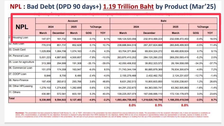 ที่น่าจับตาคือ โดยปกติคนมักไม่ค่อยปล่อยสินเชื่อบ้านเป็นหนี้เสีย ทว่าปัจจุบัน “หนี้เสียกลุ่มบ้าน” กลับมีการขยายตัวเมื่อเทียบกับช่วงเดียวกันของปีก่อน (YoY)