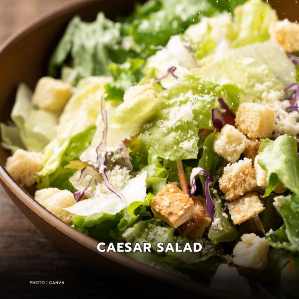 เมนูคลาสสิกที่ขาดไม่ได้เลยคือครูตอง โรยลงบนผักโรเมนสด ๆ ชีสพาร์เมซาน และน้ำสลัดซีซาร์ เข้ากันอย่างลงตัว
