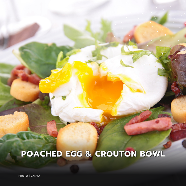 ไข่ลวกเสิร์ฟบนเตียงของผักโขม ผักย่าง และครูตอง คล้ายๆ กับสลัดเช้า