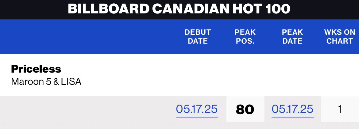 “Priceless” โดย Maroon 5 ร่วมกับ #LISA เปิดตัวที่อันดับ 80 บนชาร์ต Billboard Canadian Hot 100 เป็นเพลงที่ 9 ของ Lisa ที่ติดชาร์ตนี้