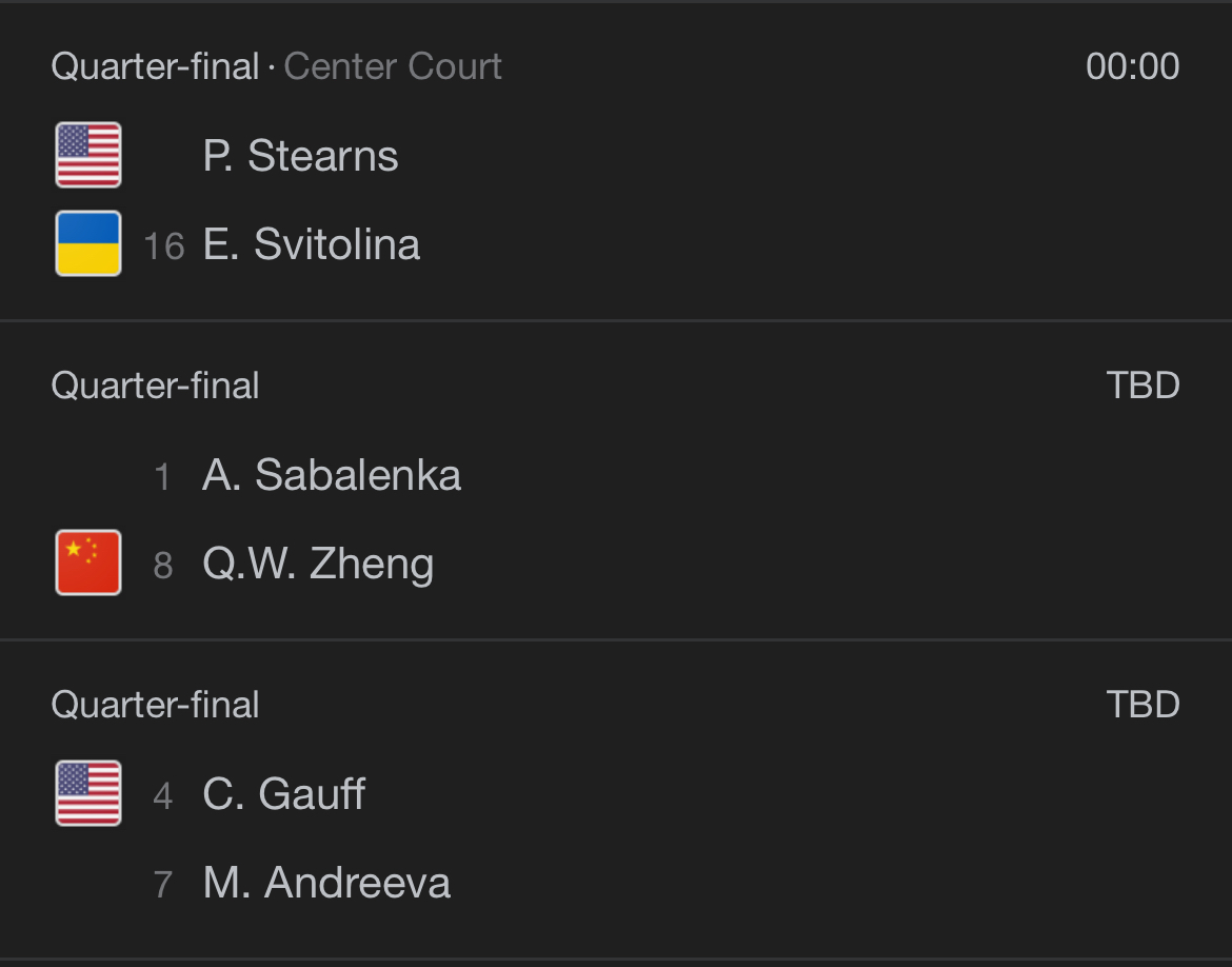 ฝั่งหญิงได้ผู้เข้ารอบ QF ครบทุกเป็นที่เรียบร้อยแล้ว โดยคู่แรกกำลังเริ่มแข่งขันกันอยู่ ระหว่าง Paolini กับ Shnaider และคู่ต่อไปจะเริ่มเวลาเที่ยงคืนของวันนี้