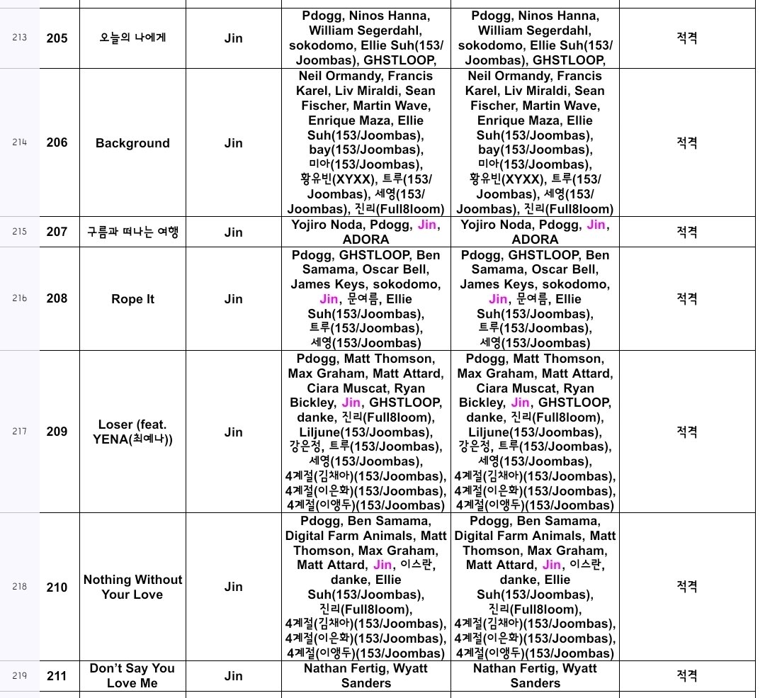 BTS Jin ได้รับเครดิตในฐานะ 'นักแต่งเพลง' และ 'นักประพันธ์เพลง' จำนวน 4 เพลงจากทั้งหมด 7 เพลงในอัลบั้ม ECHO ของเขา