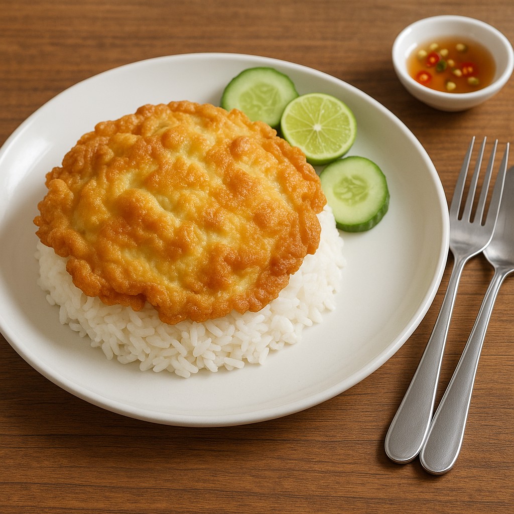 ข้าวไข่เจียวทานกับซอสพริกหรือซอสมะเขือเทศ