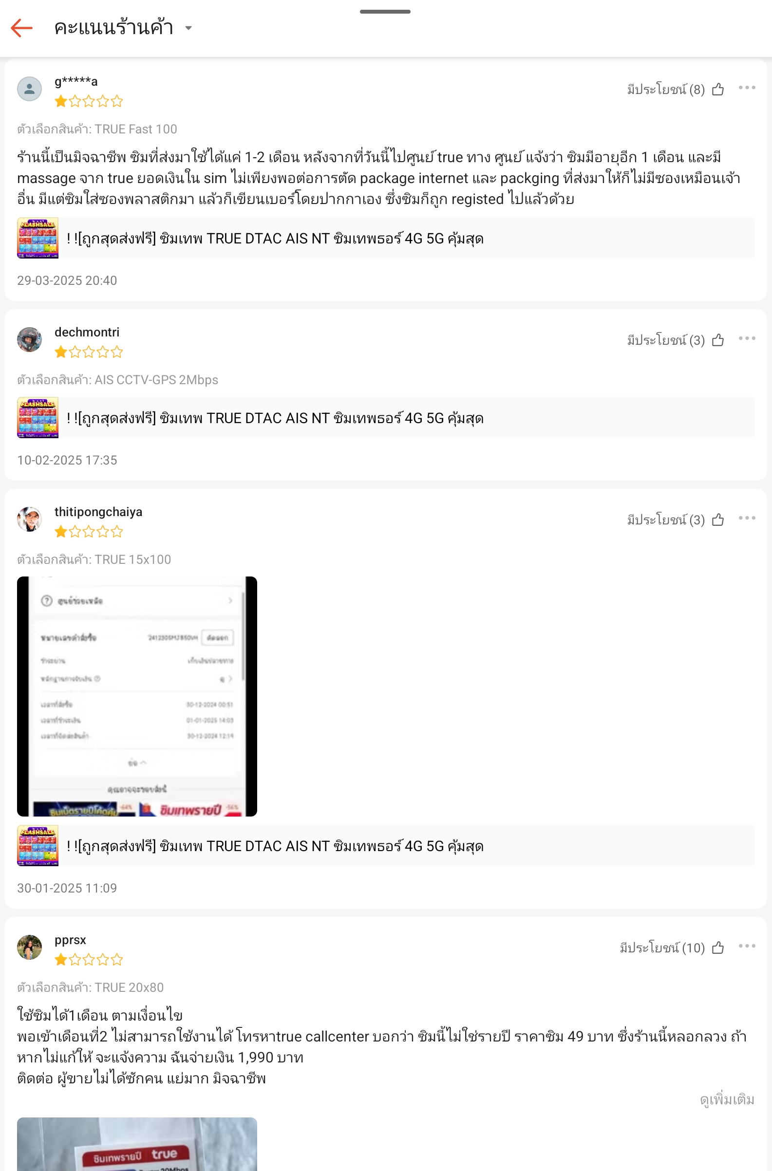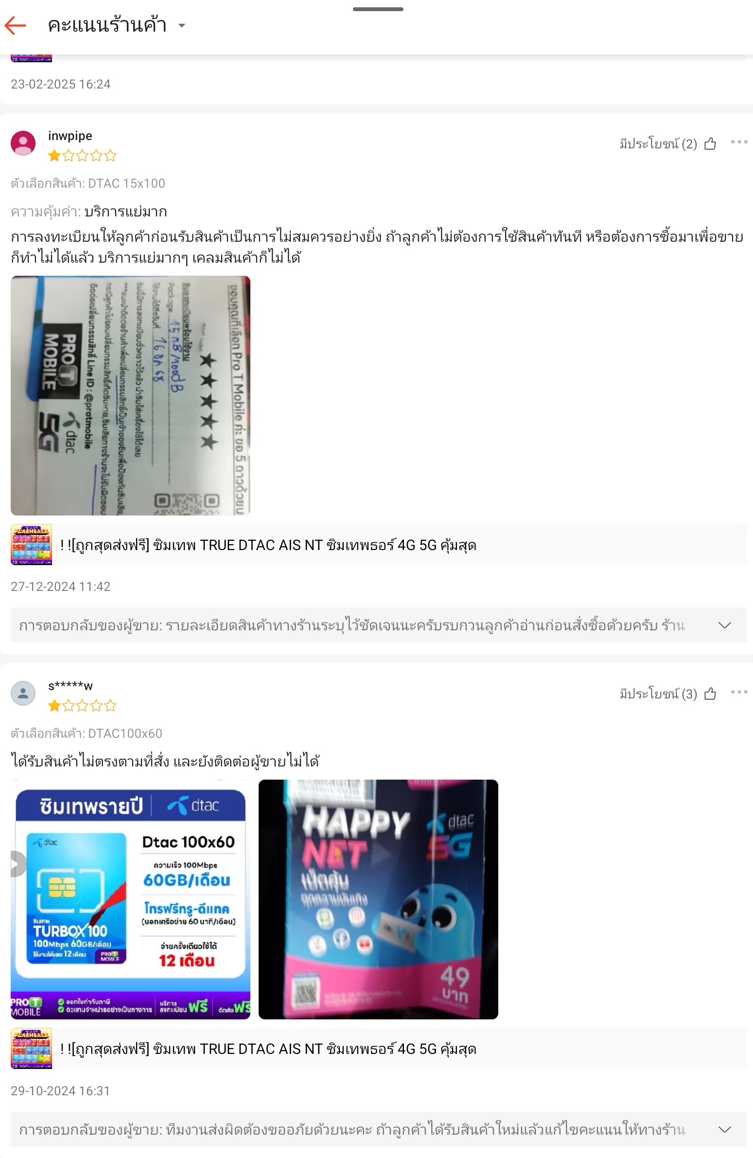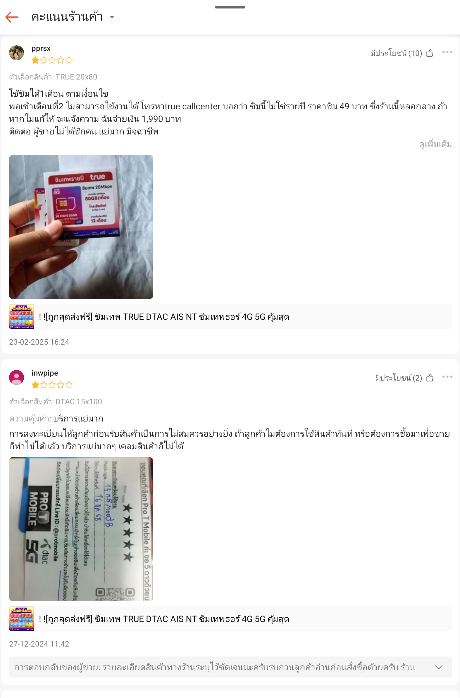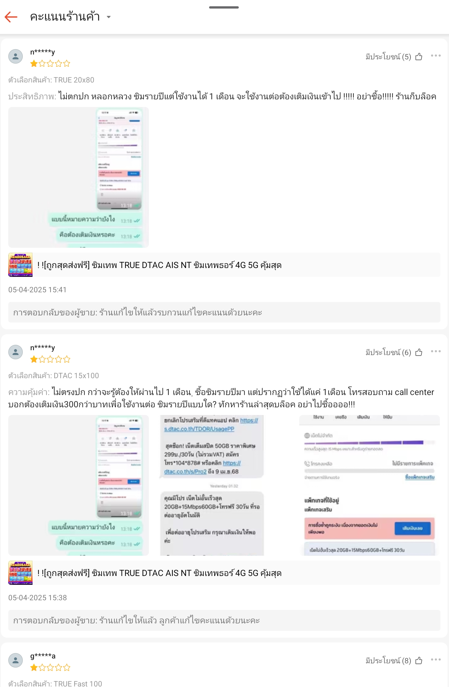จากนั้นแฟนผมจึงสอนผมว่าคราวหลังจะซื้อให้ดูรีวิว 1ดาวของร้านค้า(ไม่ใช่รีวิวของตัวสินค้า) ผมพบว่าร้านนี้มีพฤติกรรมแบบนี้ตั้งแต่ปลายปีที่แล้ว แต่ทาง shopee ก็ไม่ได้จัดการอะไรเลย ปล่อยให้มาหลอกคนต่อได้แบบนี้